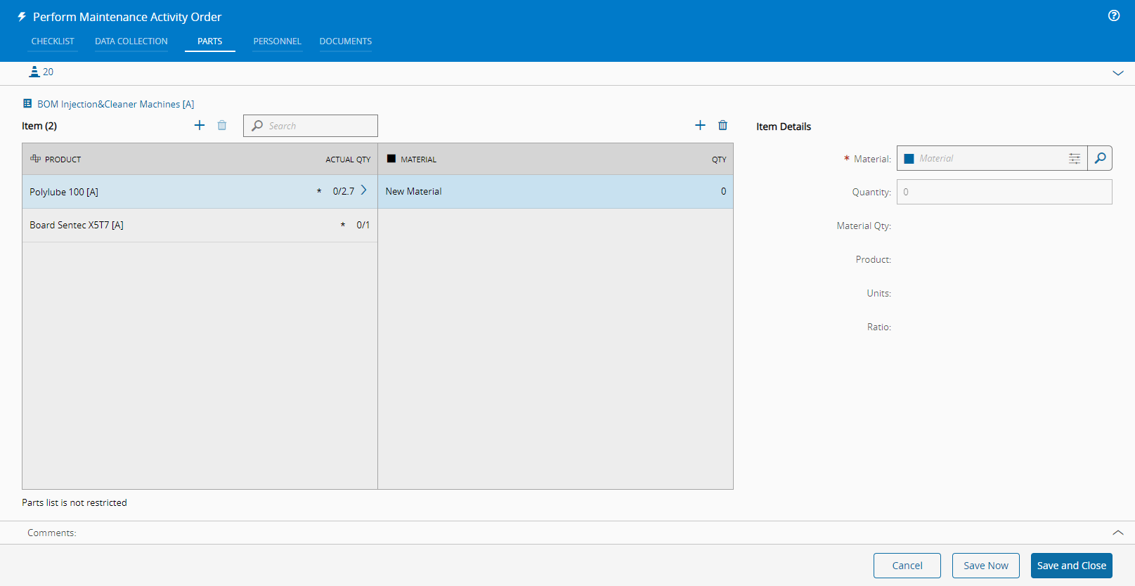 Parts are consumed according to a pre-defined BOM. Parts are implemented as Products. Products can be configured to be consumed (from Materials) or not. If Products need to be consumed, you must provide the Materials from which the quantities will be consumed. Mandatory parts must be consumed in the exact quantity defined in the BOM.
