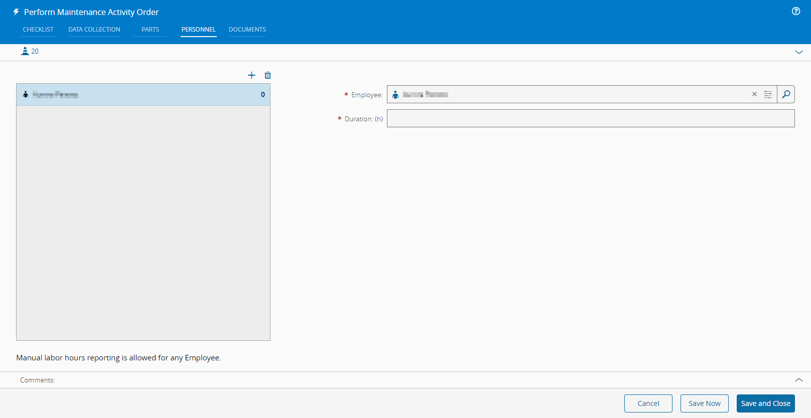 If the MAO property EnableManualLaborReport is true, you can report labor manually when performing a MAO. Employees can be added with a certain duration in hours.