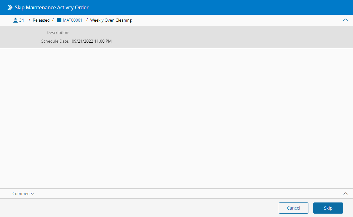 This operation skips a Maintenance Activity Order (MAO). If the MAO is Time Based, Usage Based or Time And Usage Based, it will be rescheduled automatically by the system.