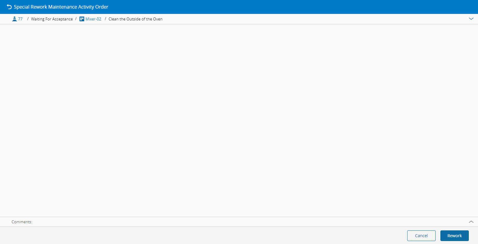 This operation is used to rework a Maintenance Activity Order (MAO), effectively creating a new MAO using the Maintenance Activity rework information. This transaction is similar to the Rework Maintenance Activity Order except that the current user is not required to belong to the Maintenance Plan Instance Owner Role of the MAO.