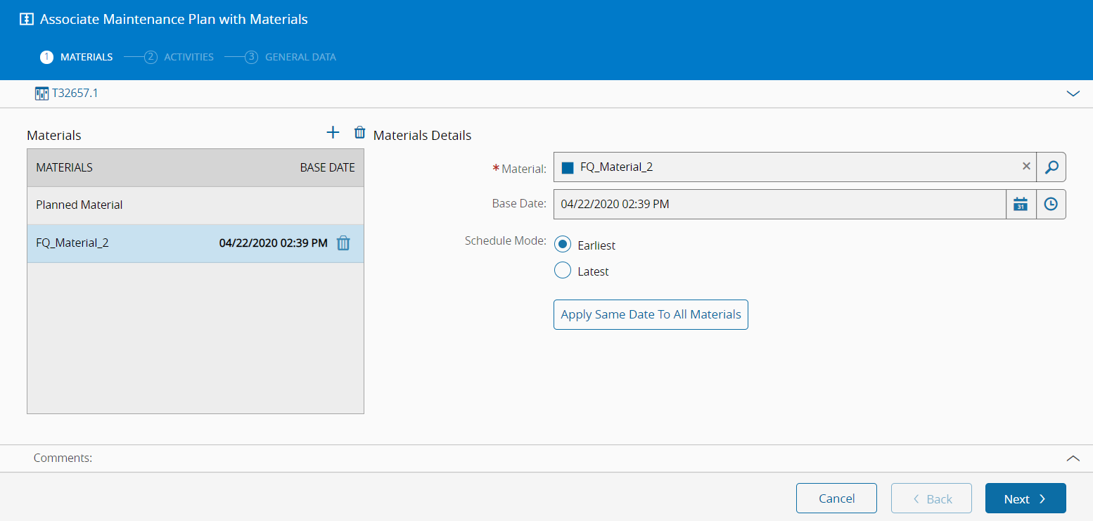 1. If wished, specify customized the Base Date and Schedule Mode for any of the Maintenance Activities that belong to the Maintenance Plan.