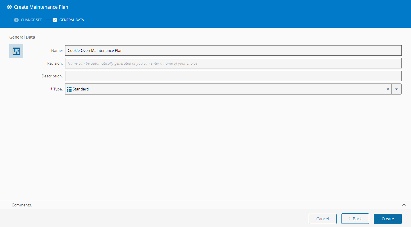 - Select the Maintenance Plan type. The list of possible values is taken from the lookup table Maintenance PlanType.