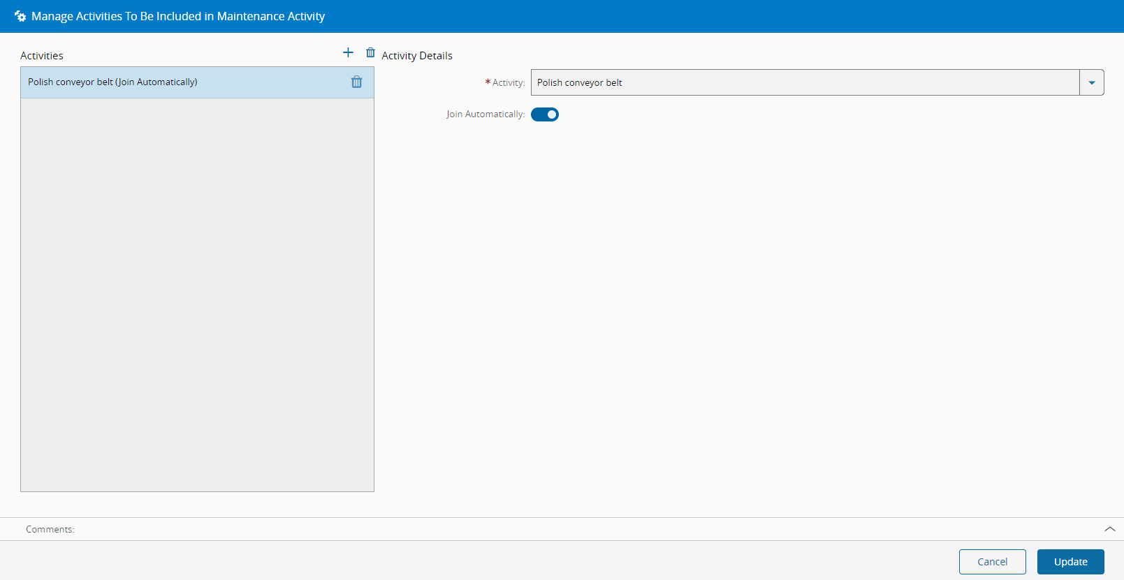 - Furthermore, to allow inclusion of one Maintenance Activity in another, the following properties must be identical:
