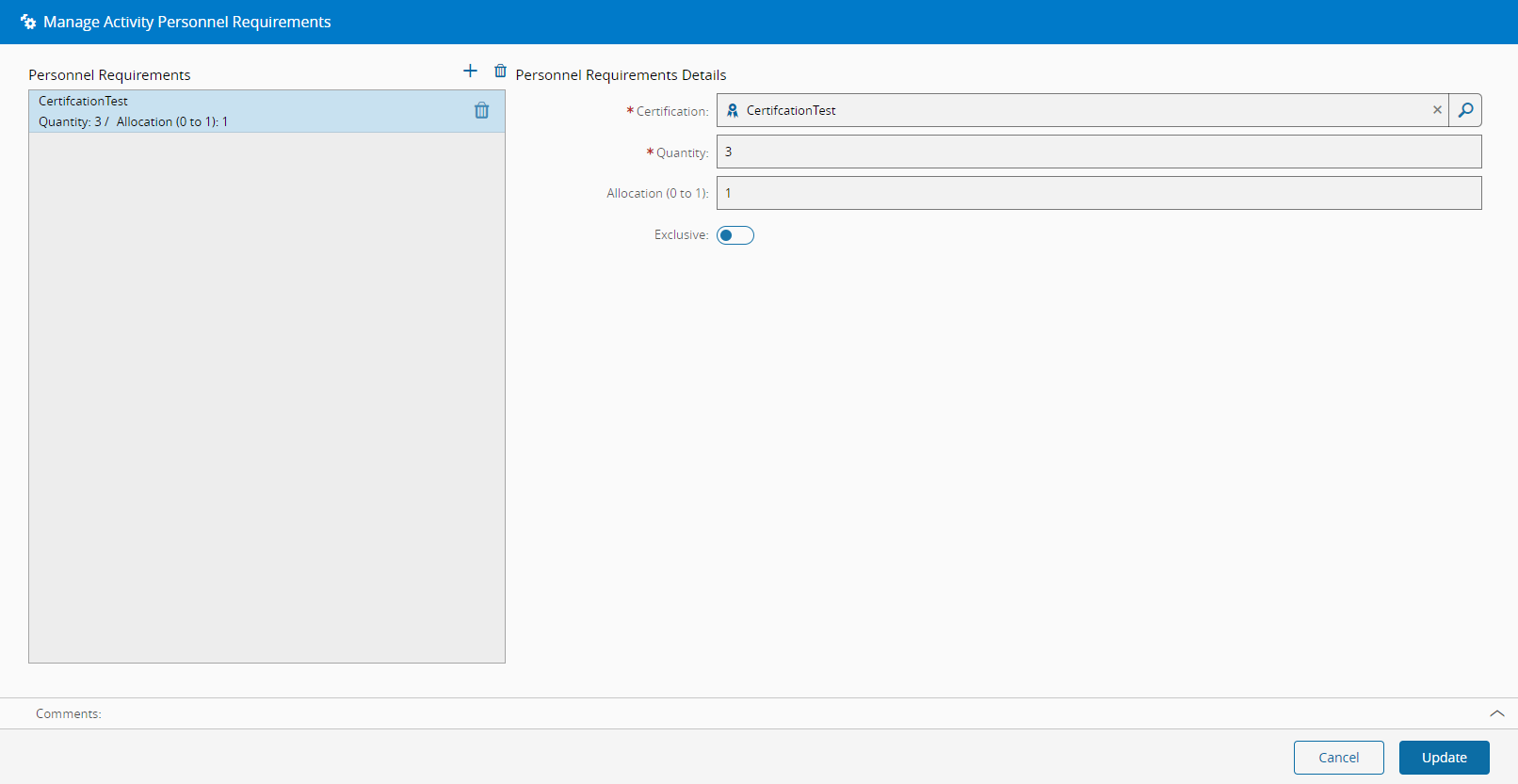Specific personnel requirements can be configured by pressing the Manage button in each of the Personnel Requirements section After opening the Manage Activity Personnel Requirements wizard, you can add or remove rules by pressing the or buttons and selecting the appropriate values for:
