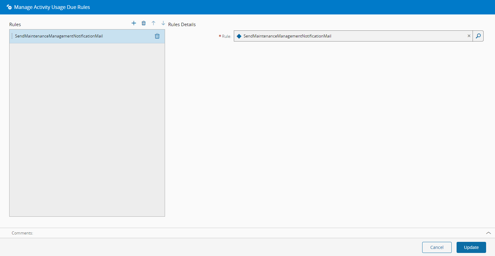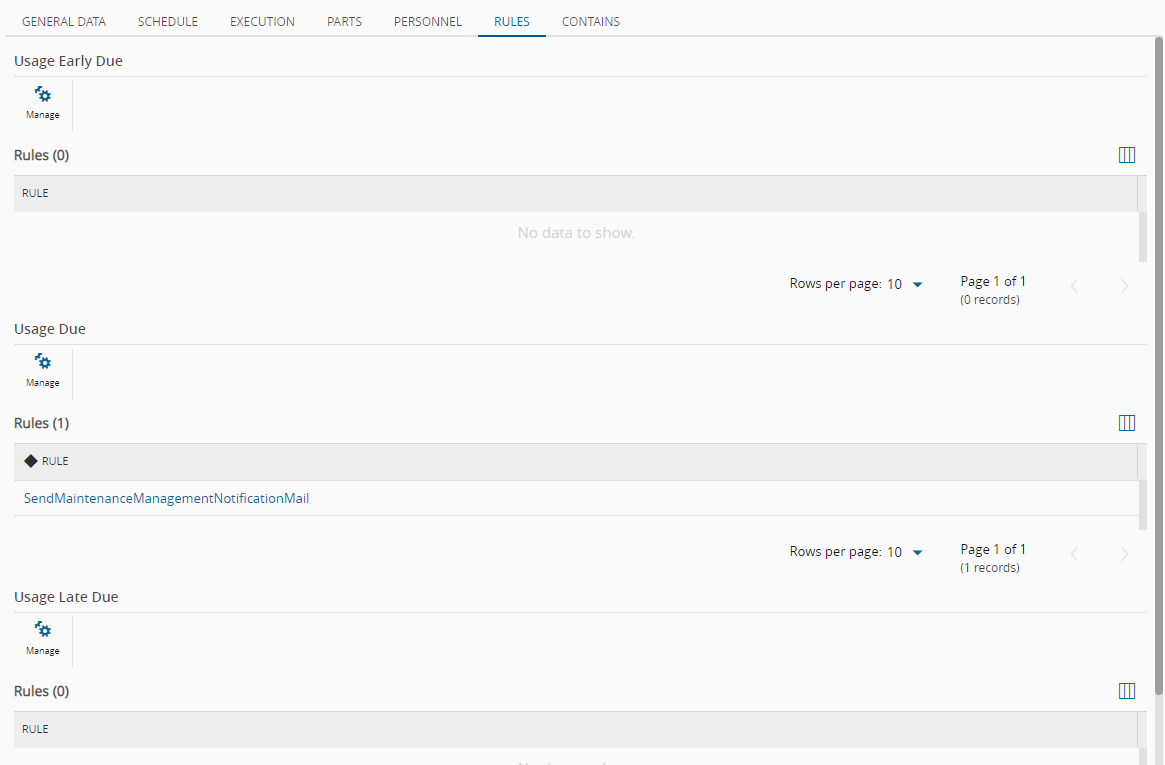 The system ships with a Rule called SendMaintenanceManagementNotificationMail which allows alerts to be sent whenever the activity reaches that state. A Rule must be defined to ensure any notification is sent to the proper recipients defined under the Distribution List property that is defined when associating the Maintenance Plan to an available entity, thus creating a Maintenance Plan Instance. If no Distribution List is defined for the Maintenance Plan Instance, a notification will be sent to all the users that have the OwnerRole assigned. For more information, see Associate Maintenance Plan.