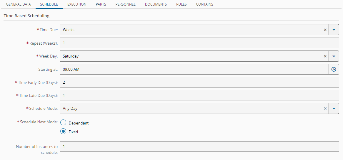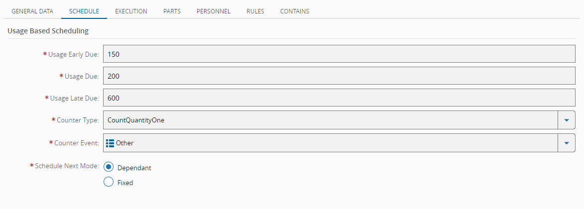 If the Schedule Type is set as Usage Based, Time Based or Usage and Time Based, the Maintenance Type can only be Preventive, Calibration or Inspection.
