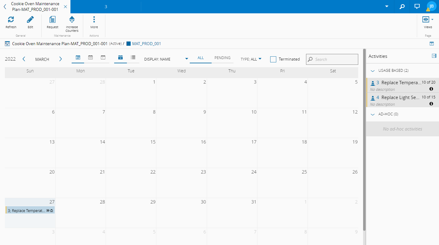 The Scheduler view displays a calendar with information on the Maintenance Activities that are a part of the current Maintenance Plan Instance.