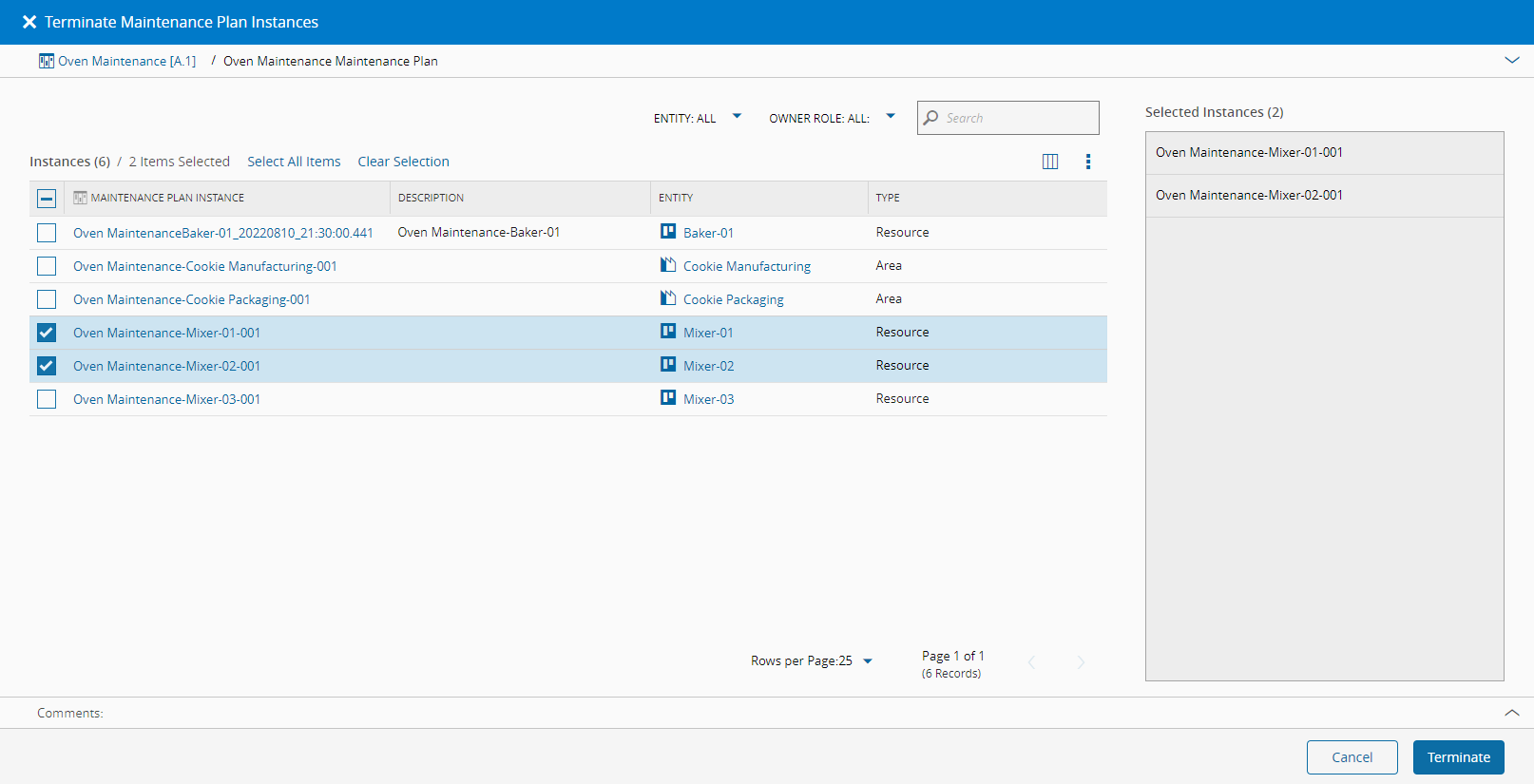 1. Choose the Maintenance Plan Instances that you wish to terminate and select Terminate to perform the operation. All generic/smart table rows that reference the current object will be removed.