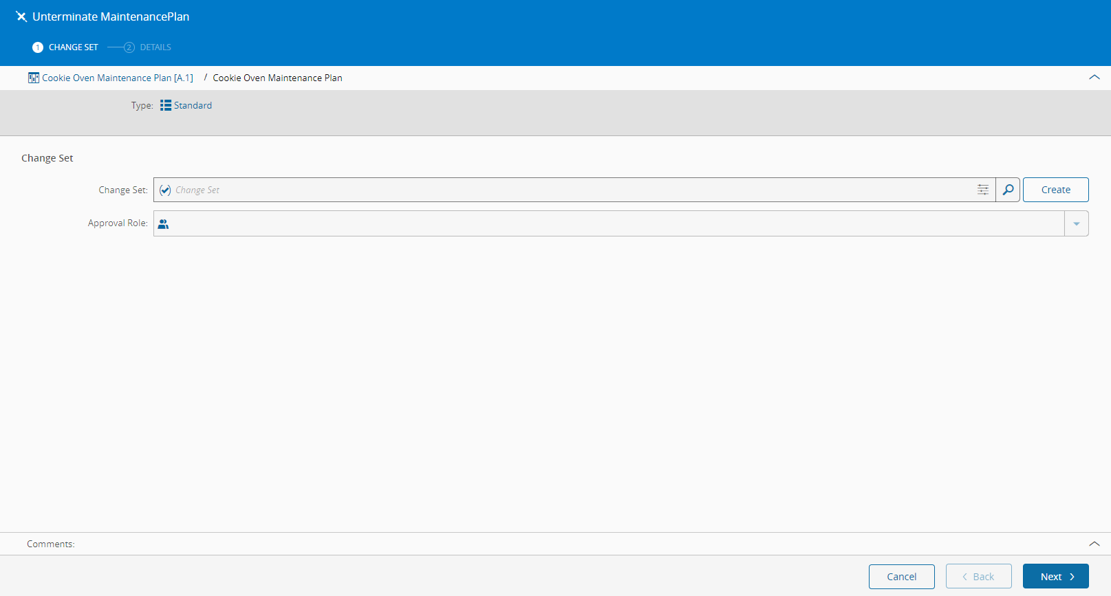 The Unterminate Maintenance Plan wizard can be called from the Maintenance Plan page within the Business Data Group.