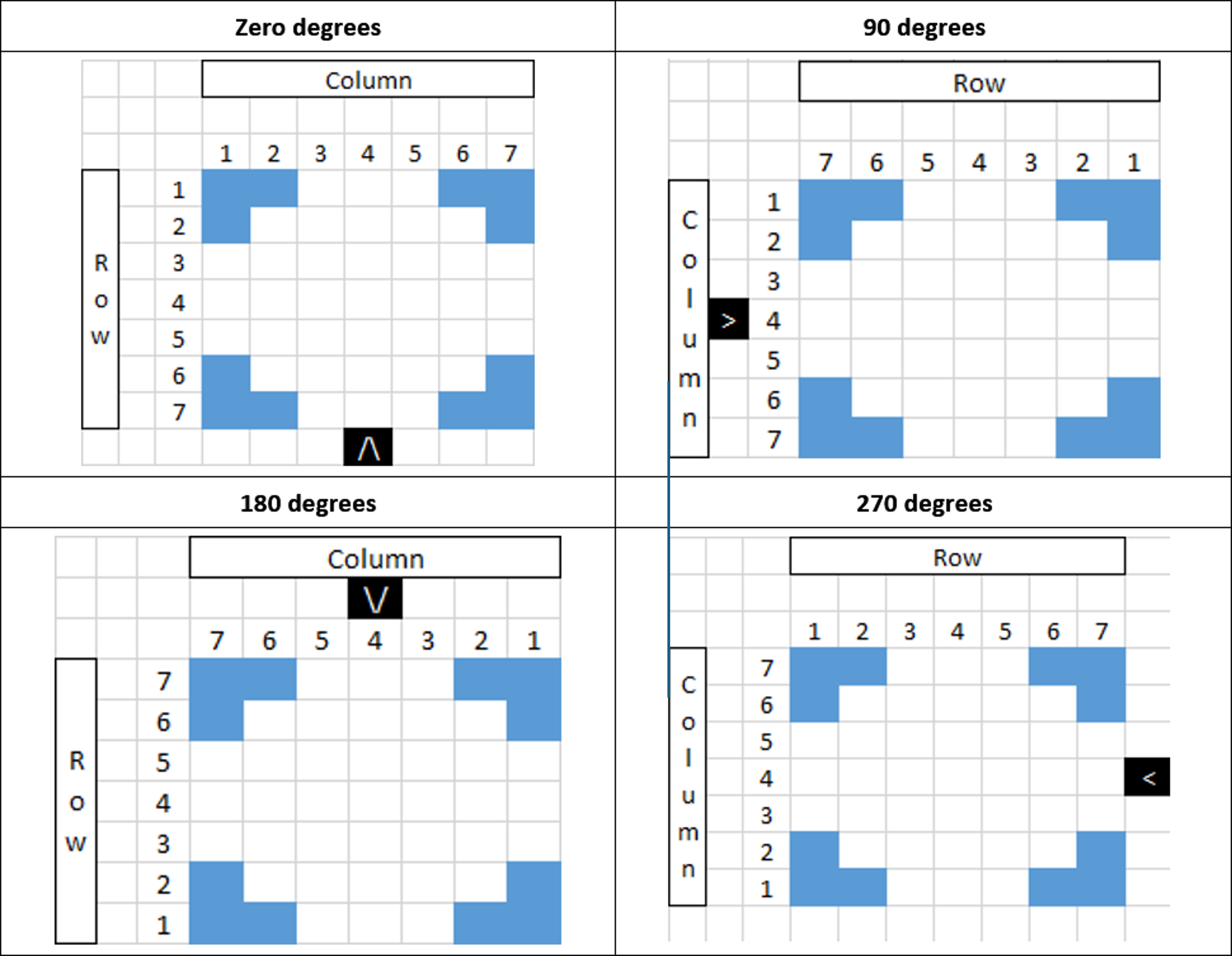The rotation, by convention counter clockwise, defines the number of degrees that the map is rotated. The example below describes the different rotation degrees with a notch at the bottom.