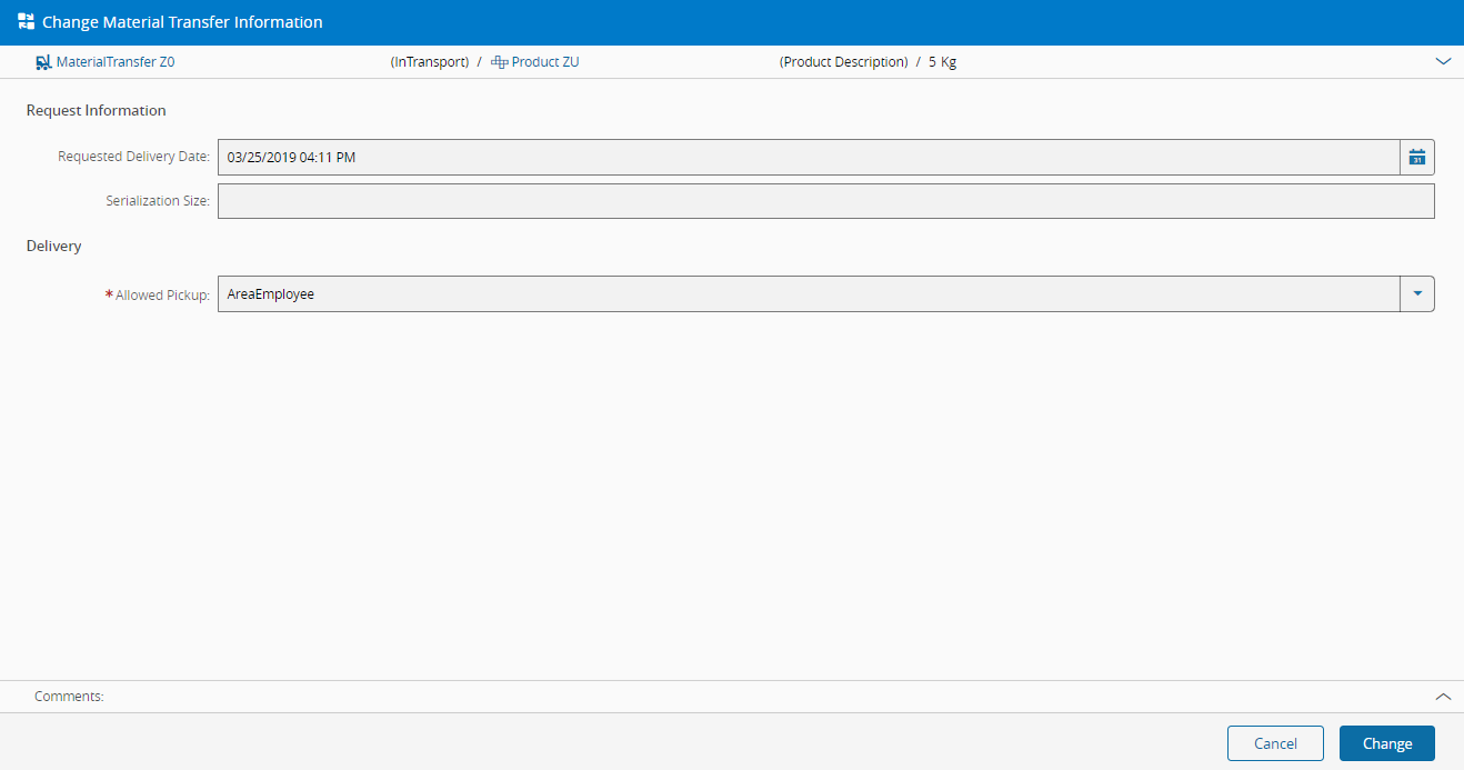 This operation is used to change the Serialization Size, the Allowed Pickup or the Requested Delivery Date of a Material Transfer.