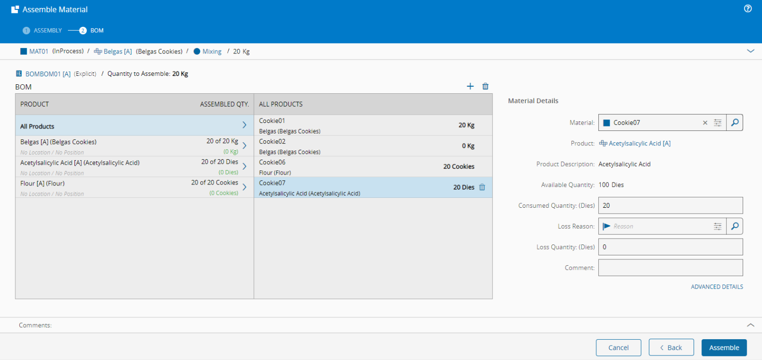 - the source Material and the assembly quantity (in case they are not already being displayed).