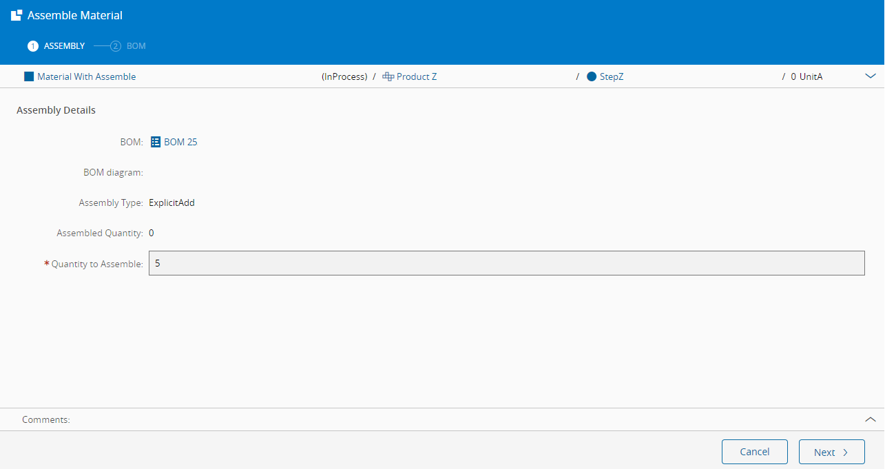 - If the AssemblyType is Explicit or ExplictLongRunning, the Final AssembledQuantity must be less than or equal to the Material PrimaryQuantity or SecondaryQuantity (matching the BOM units).