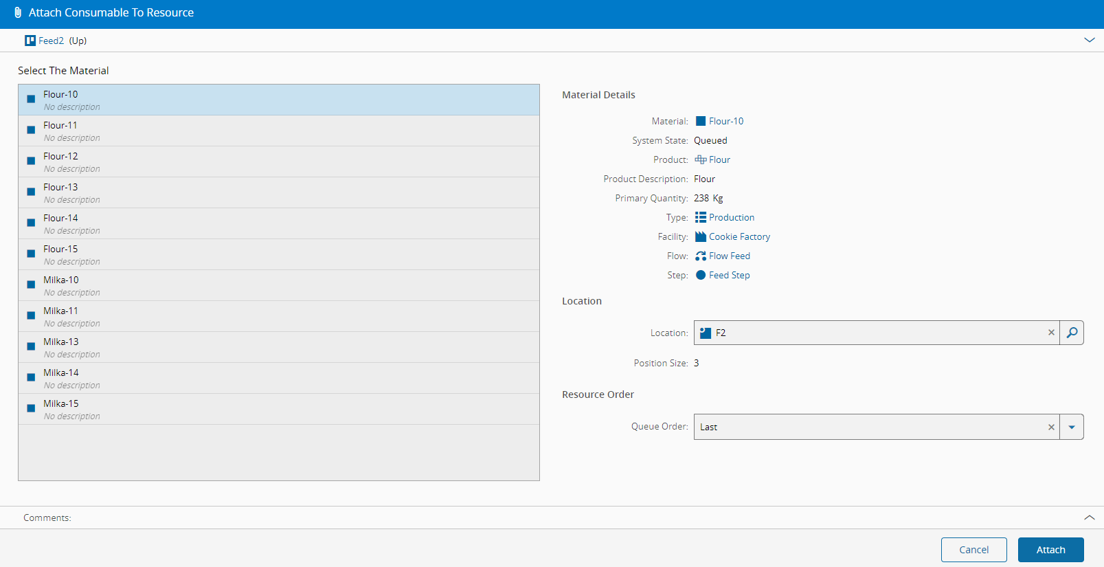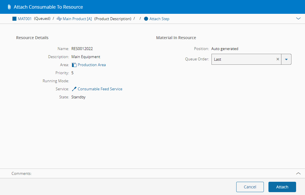 This operation is used to attach a consumable Material to a consumable feed Resource. This operation is normally used with Automatic Material Assembling.