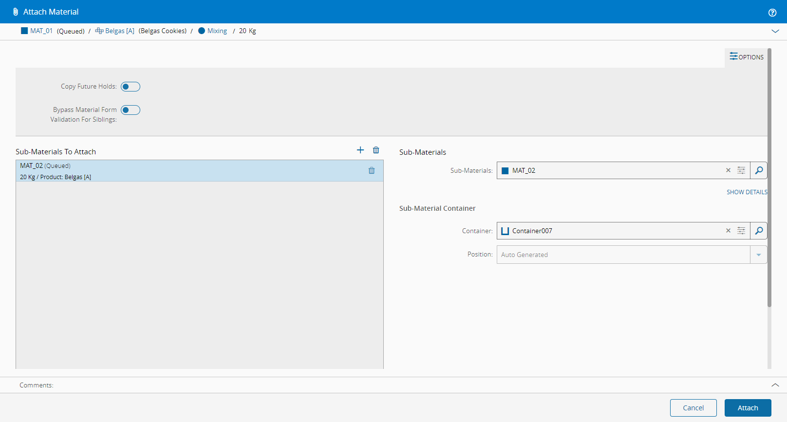 The Attach Material wizard is called from the Details page of the selected Material. Depending on the current system status, the Attach Material button may be visible on the top ribbon or under the More actions button.