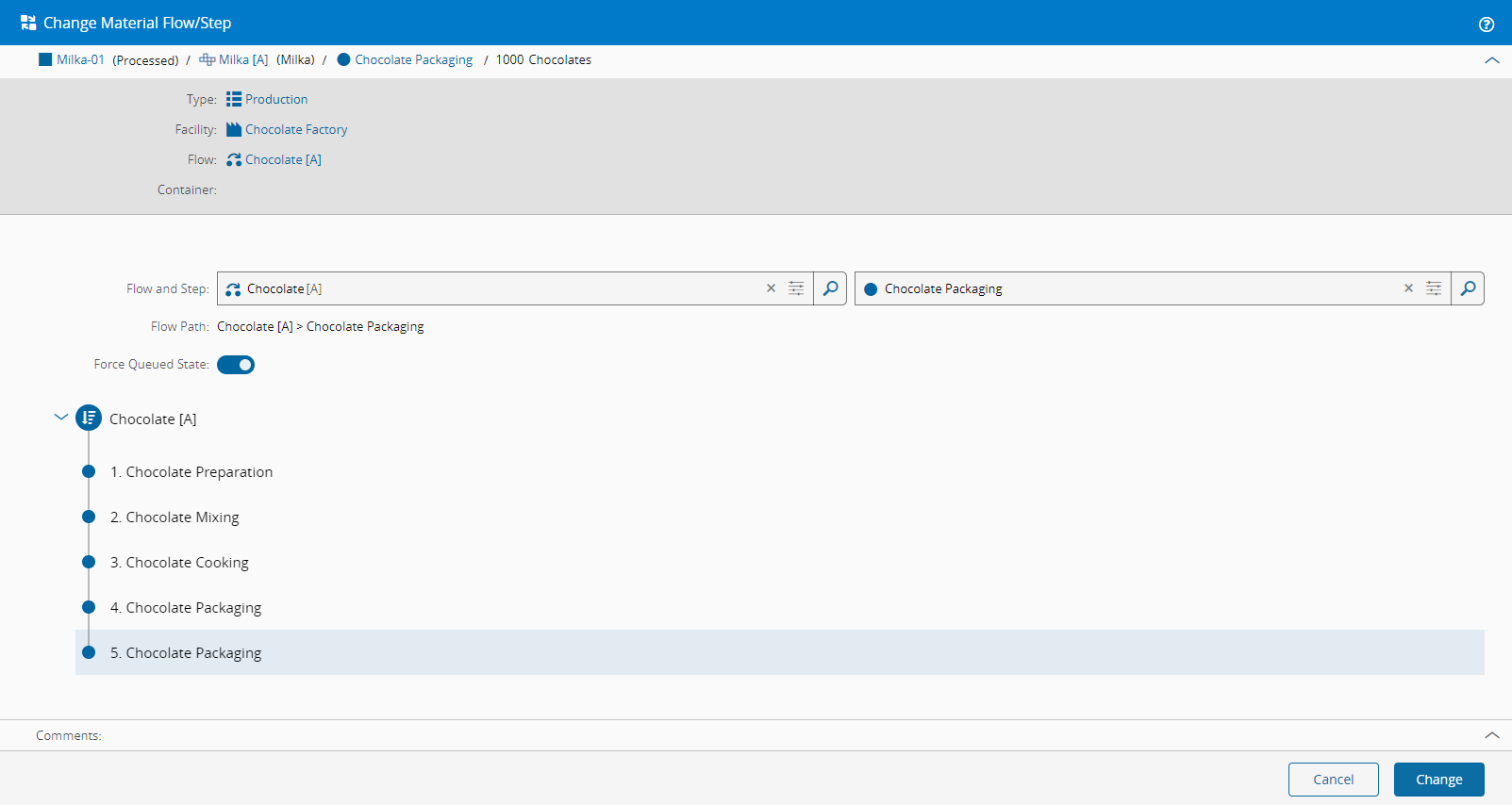 Choose a new Flow Path by selecting a Flow followed by a Step, or directly in the Flow structure. When altering Steps, the system will revert the Material state to Queued. In cases where the same Step is repeated in the Flow and the Material is in a Processed state (as depicted in the image below), you may opt to enable Force Queued State. Otherwise, the Material will stay in the Process state.