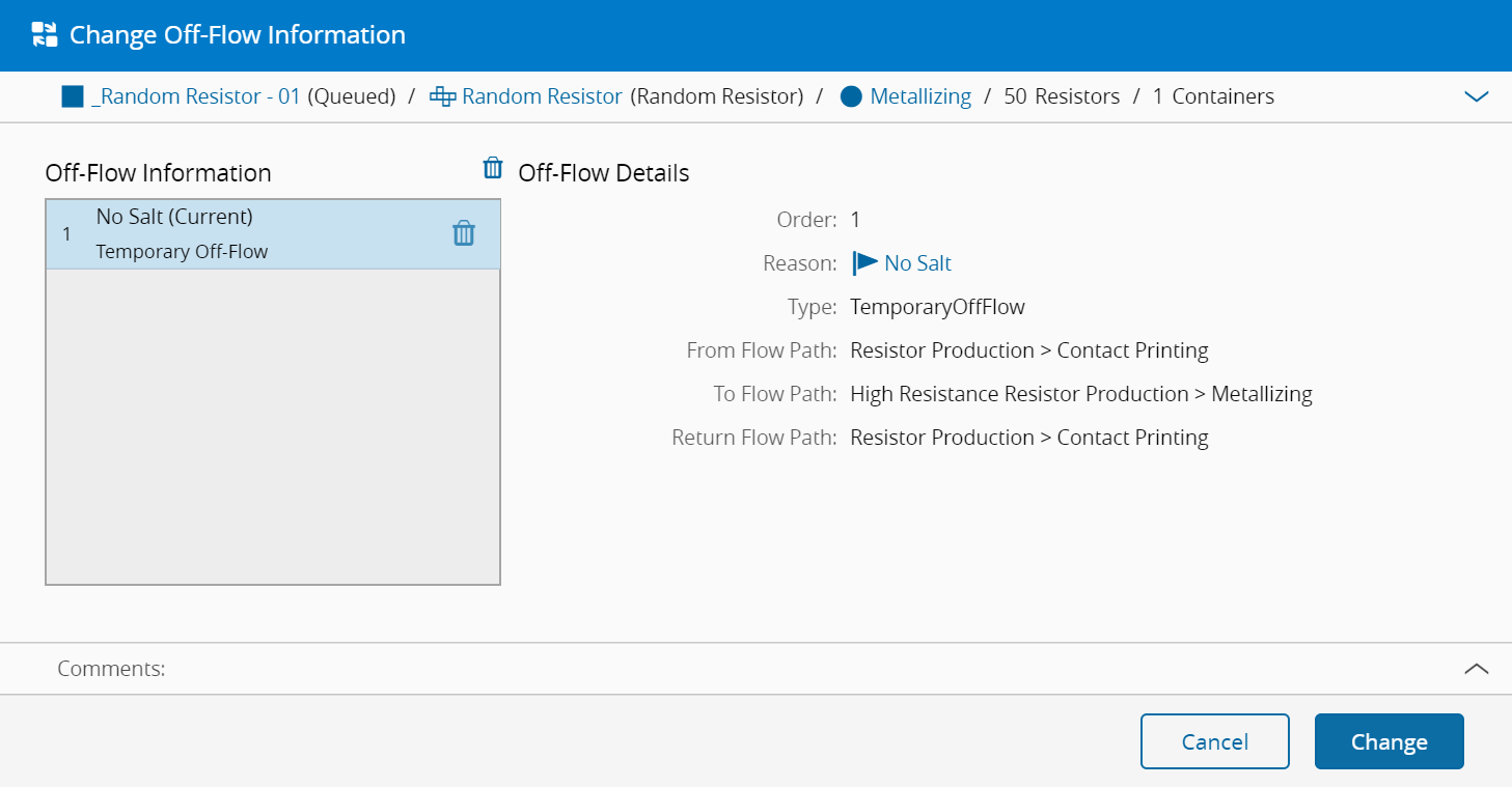 - For Off-Flows of type Rework: the Return Flow Path can be edited by selecting a new Return Flow Path.