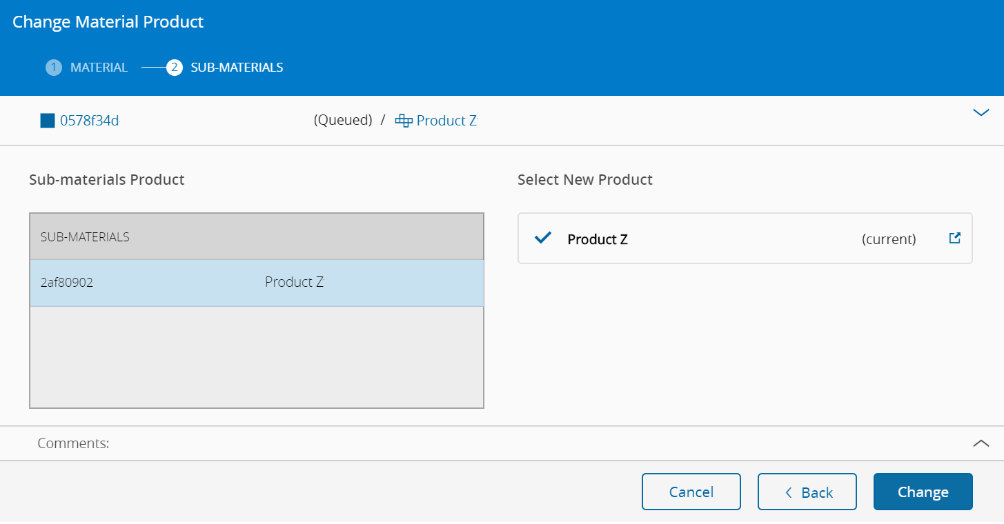 - Select a new Product from a list of existing products, both for Material and sub-material(s).