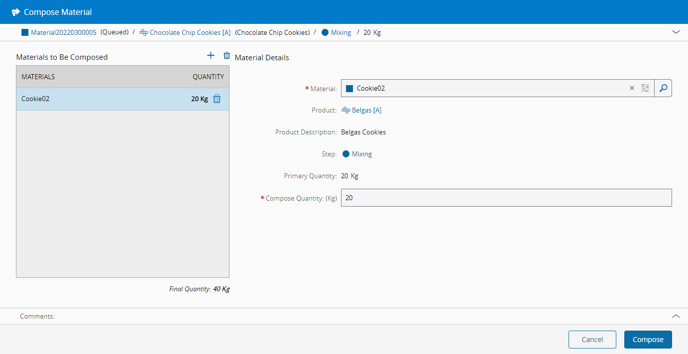 Choose the Materials to compose by selecting the icon. For each Material, specify the Primary and, if defined, the Secondary Quantities. It is also possible to remove the Materials by selecting the icon. To perform the transaction, it is necessary to select at least one Source Material.