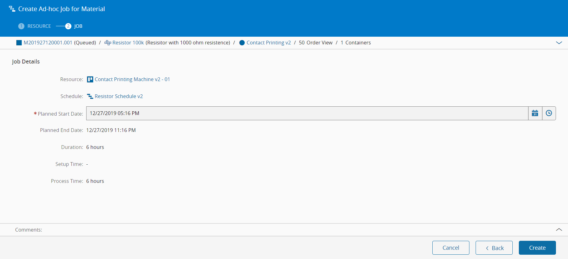 - Schedule exists and it is Active and the same Schedule must be associated with the Step's Area (at the Material Facility) and the Resource's Area.