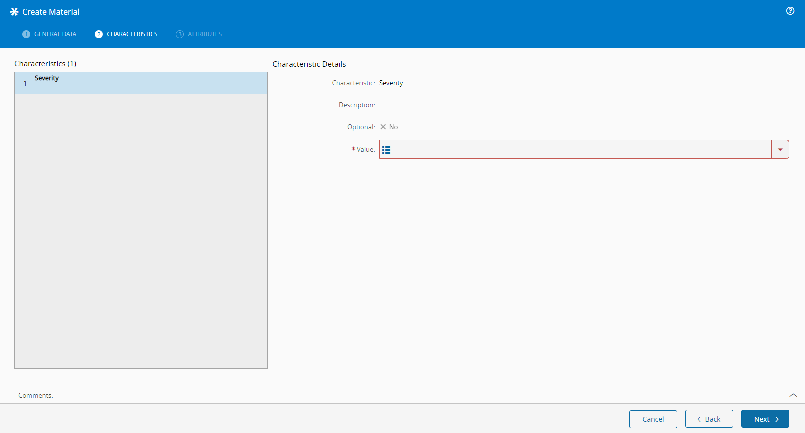 Specify the Value - this applies because the selected Material Product has Characteristics configured to
