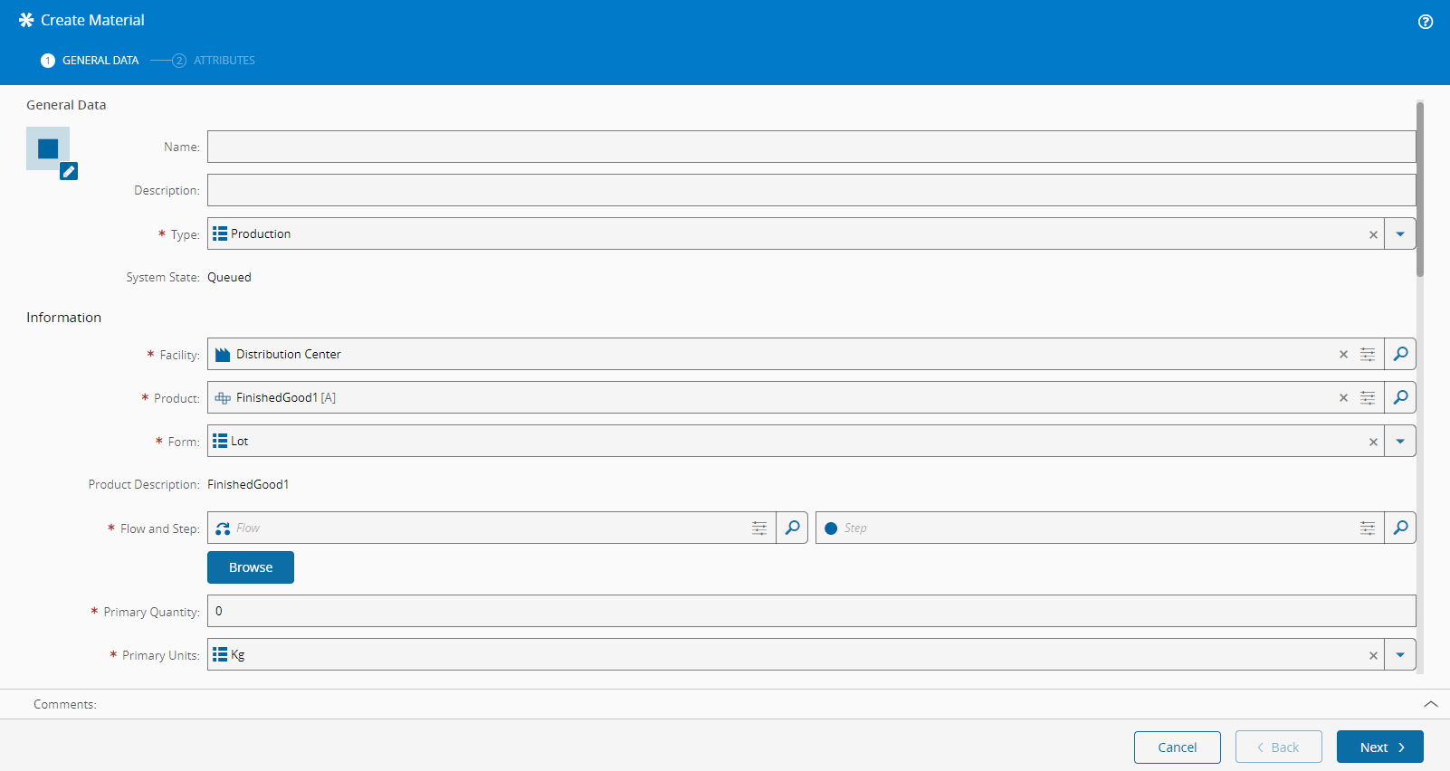 Print Material Labels Automaticallyproperty set totrue, that information will be displayed on the bottom section of the wizard.- If the selected Material Product has configured characteristics, a Characteristics step is enabled (see below).