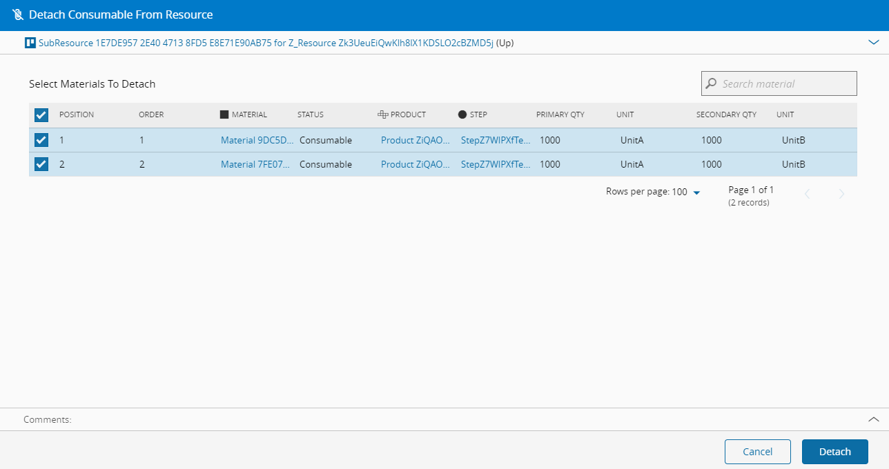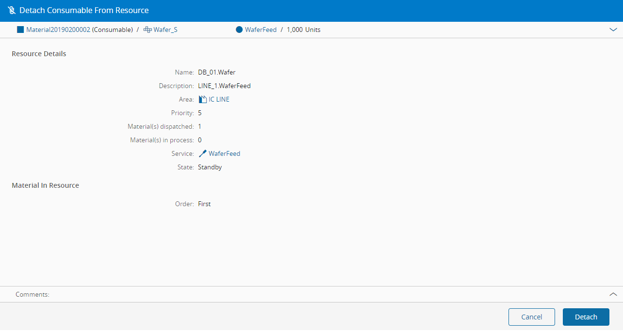 This operation is used to detach a consumable Material from a Resource. The Material can be detached as a Consumable from the perspective of the Resource or from the perspective of the Material and both options are represented in the images below.
