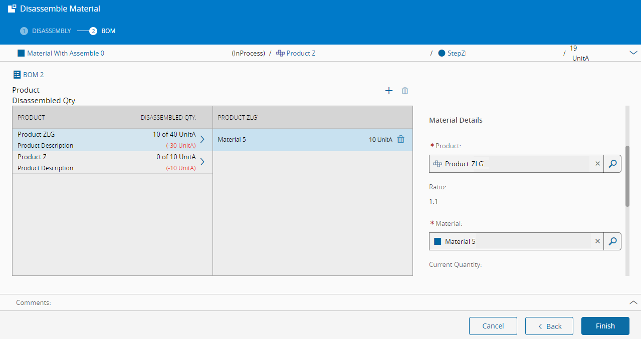 - The Disassembled MaterialQuantity must be greater than zero and less or equal to the AssembledQuantity of the Material.