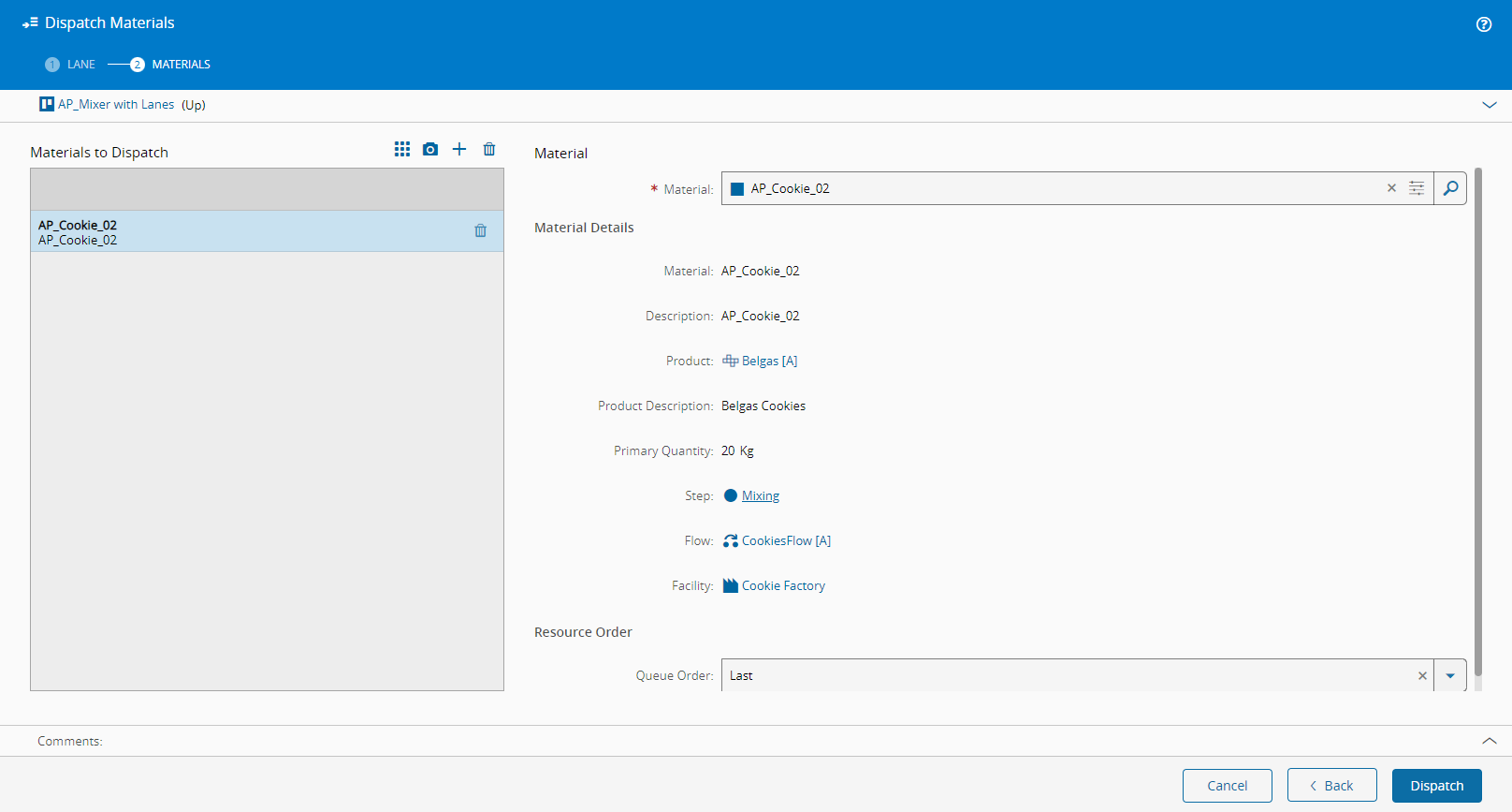 True, in this case a valid Lane of the Resource must be provided. - Materials are dispatched to the same Resource and Lane.