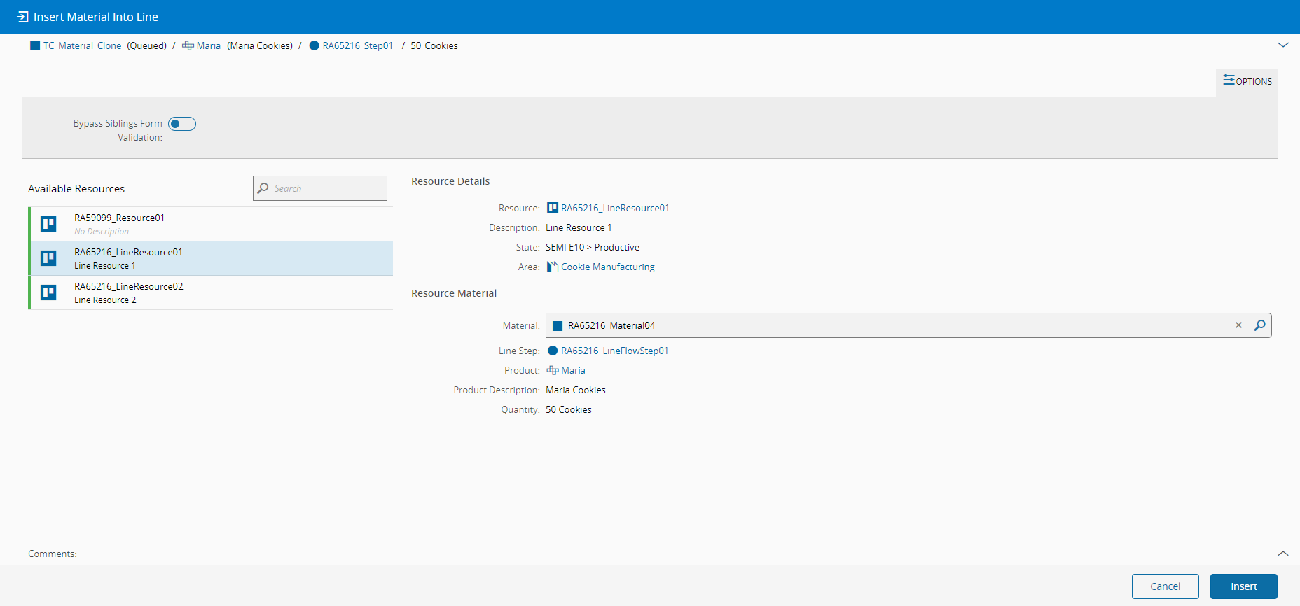 This operation is used to insert a Material into a parent Material that is tracked-in (in process) at a Line. As a naming convention, the Material to be inserted is called Child Material and the Material where the Material will be inserted is called Parent Material.