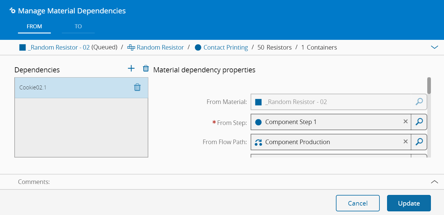 - To manage the successor dependencies, that is, dependencies From the current Material go to the FROM tab. To manage predecessor dependencies, that is, To the current Material, go to the TO tab.