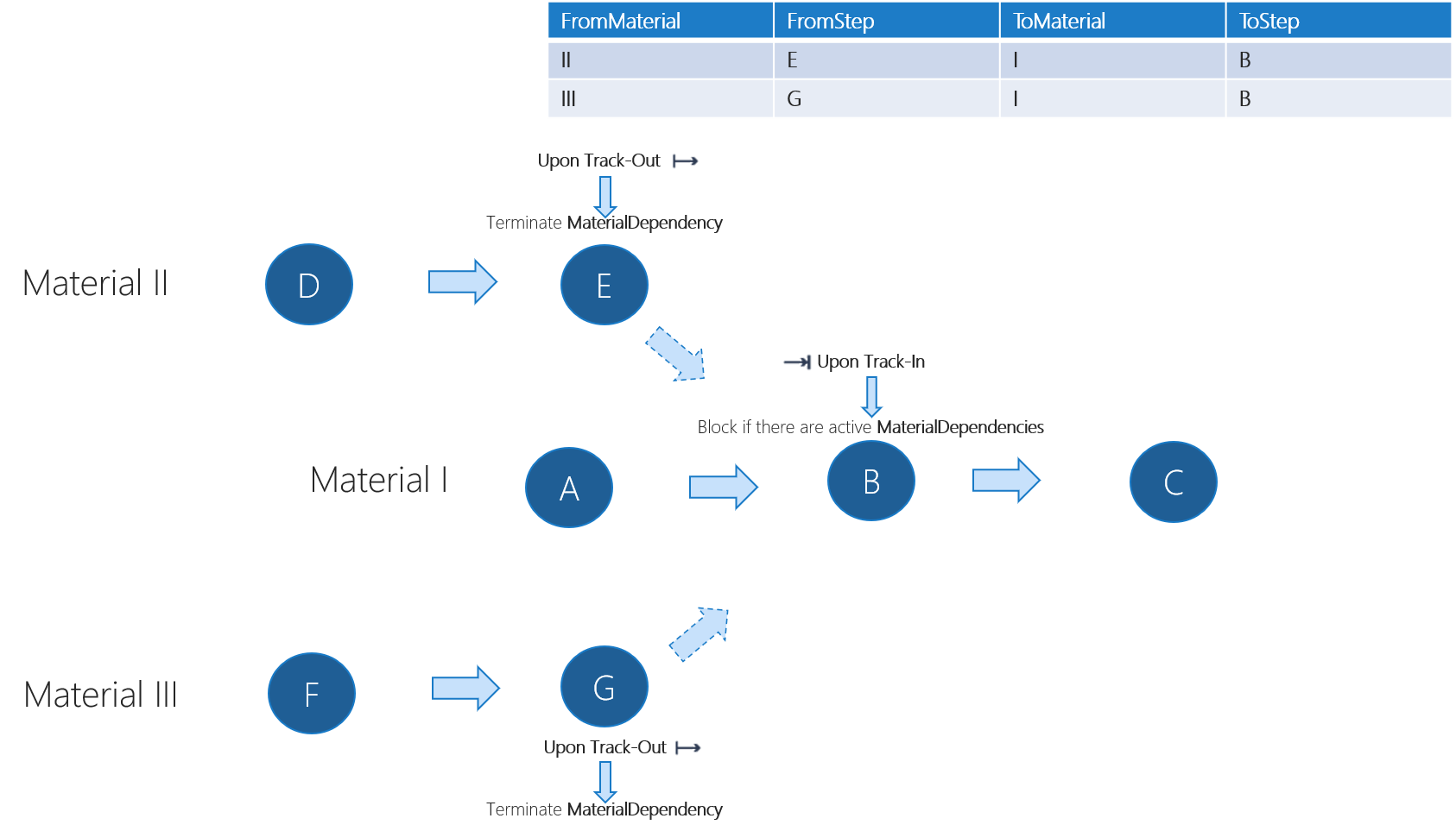 - During Track-in of the successor Material (To Material) at the chosen Step (To Step), the system checks if there any MaterialDependencies referencing the pair (ToMaterial, ToStep); if so, an error is thrown. In order to remove this obstacle, all the predecessor Materials (FromMaterial) must have previously been Tracked-Out of the predecessor Step (FromStep), which automatically terminates any MaterialDependencies containing that pair (FromMaterial, FromStep). This validation is exemplified in the following picture.