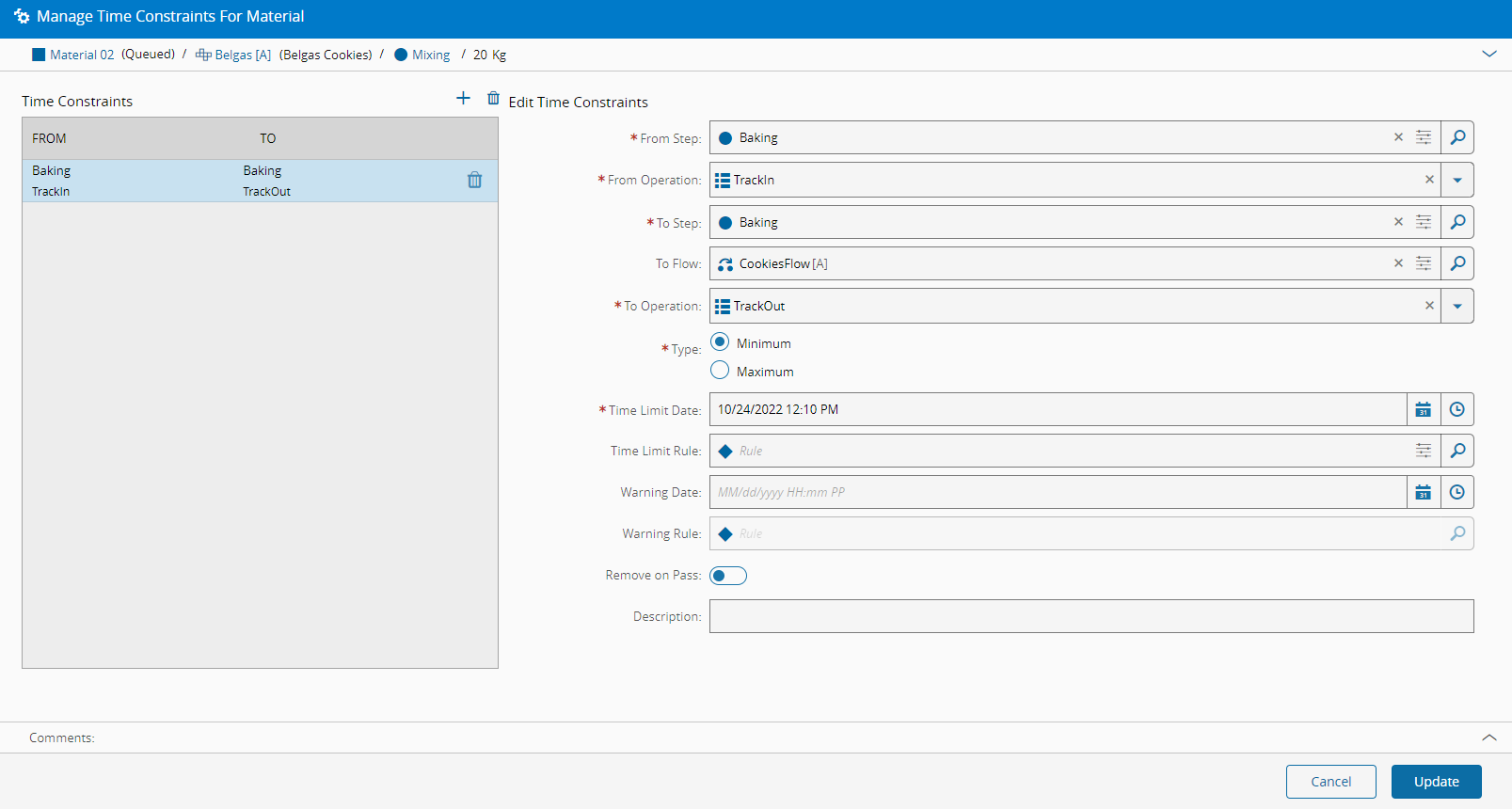 - To add new Time Constraints to the Material, press Add. Then, enter the following mandatory information: