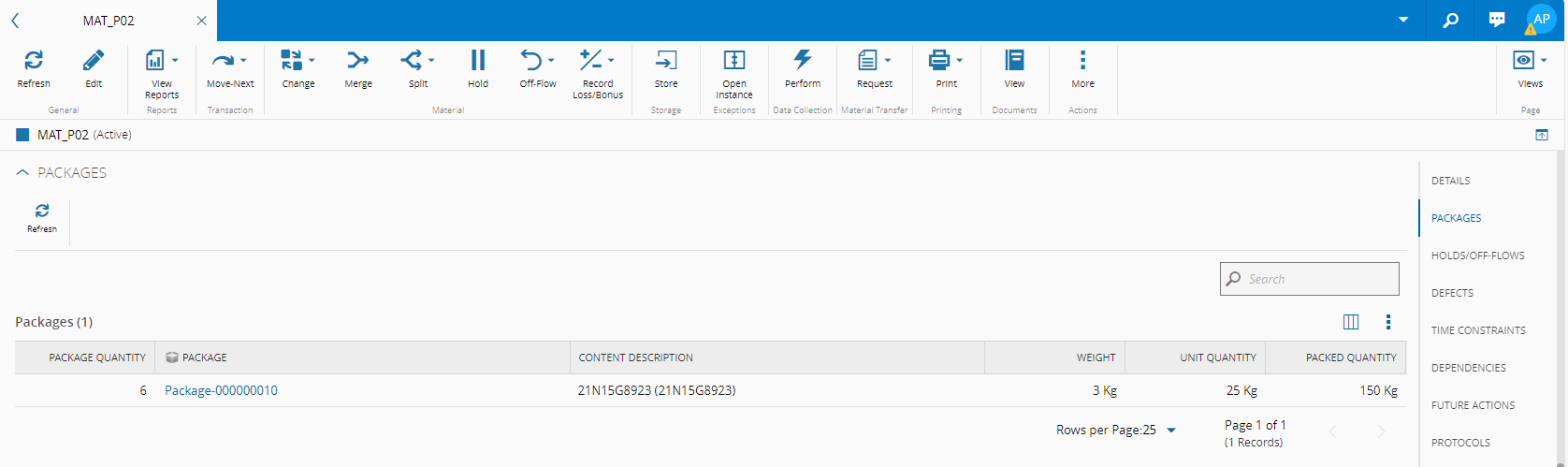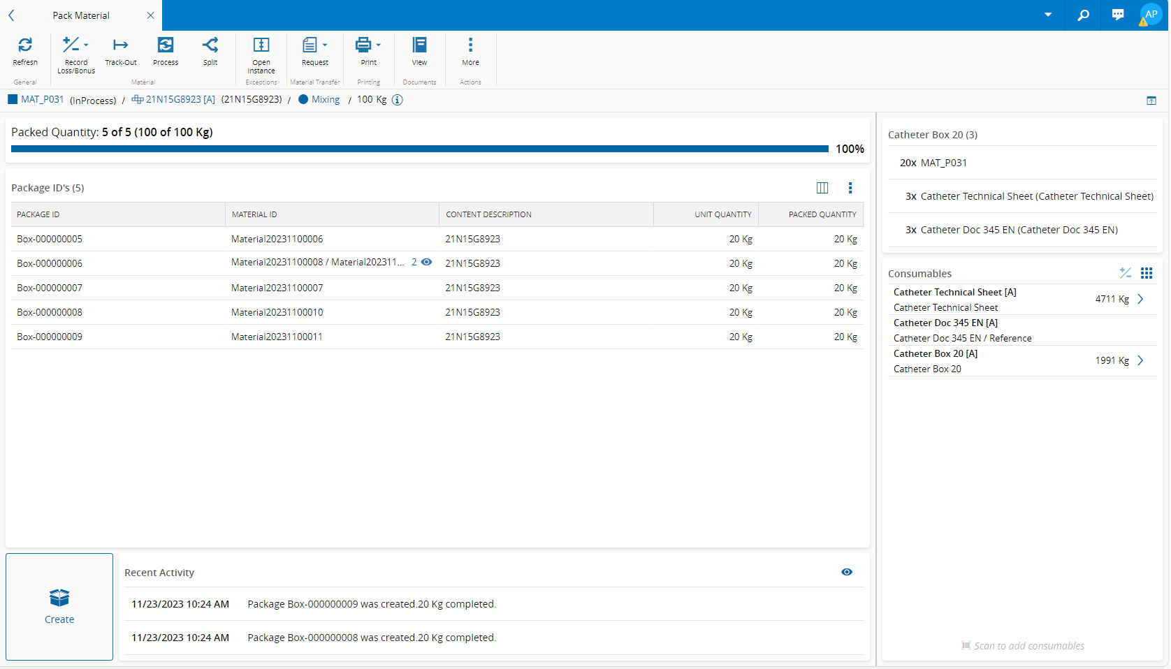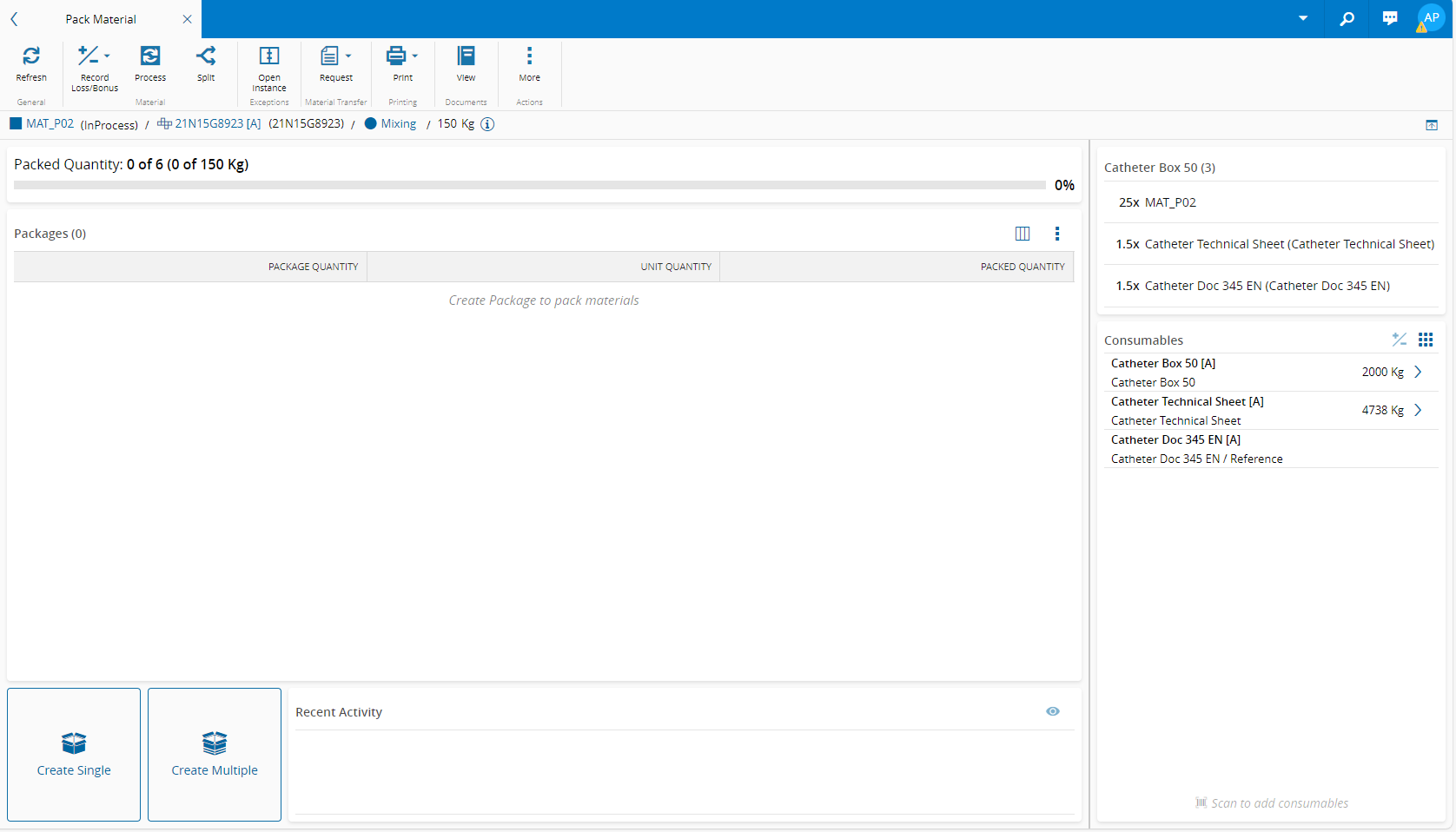 - Two Actions - in Material Quantity mode it is possible to Create Single or Create Multiple package(s).