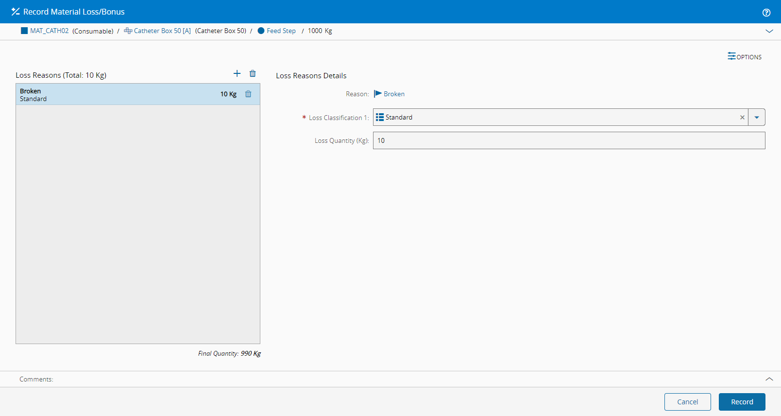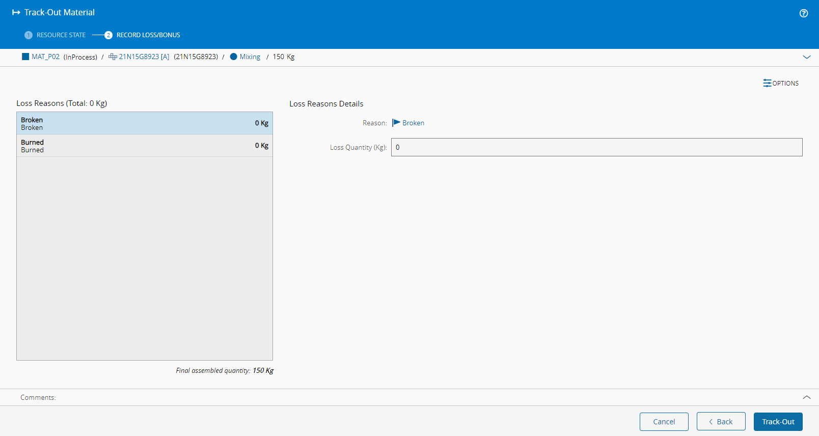 When all the Material is packed, you can Track-Out. When you track out, you will see Resource State information, and will be able to Record Loss/Bonus.