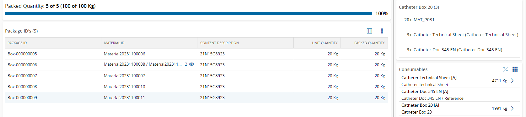 - The Material and Sub-Materials Primary Quantity must be equal to the Total Packed Quantity of all the Active Packages that reference that Material - including Packages of Content Type Material Ids.