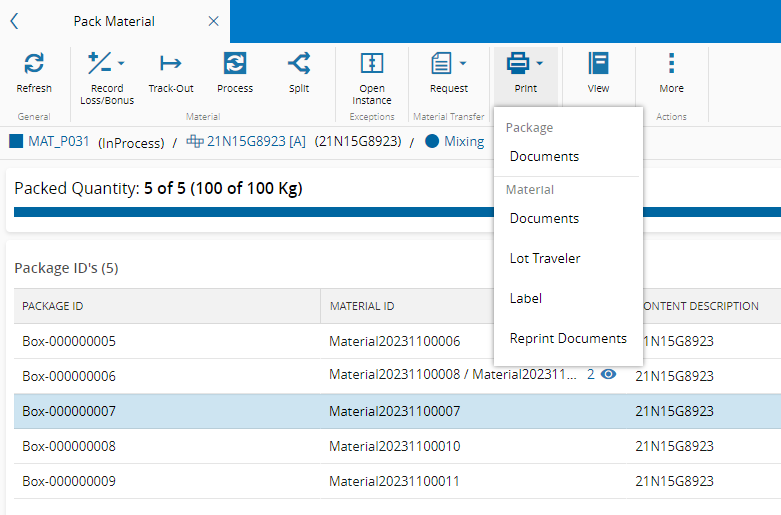 If configured in the MaterialPackingPrintableDocumentContext smart table, you can print the documents for the package that are associated with the Close Operation. Select the package, select Print on the top ribbon, and then select the appropriate option.