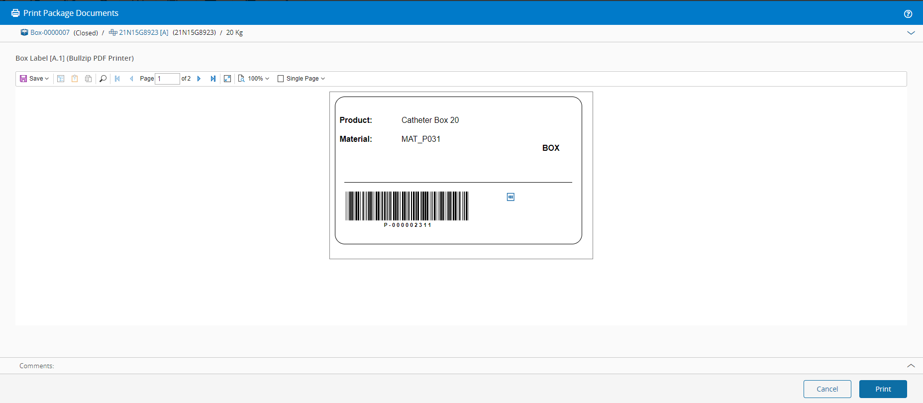 For Level 1 packing, only the configured Printable Document(s) for the Close Operation are printed.Example of a Package document: