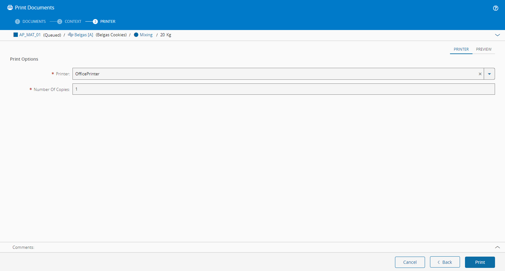 The Print Documents wizard will show a document or a list of documents that are associated to the Material and that are able to be printed.