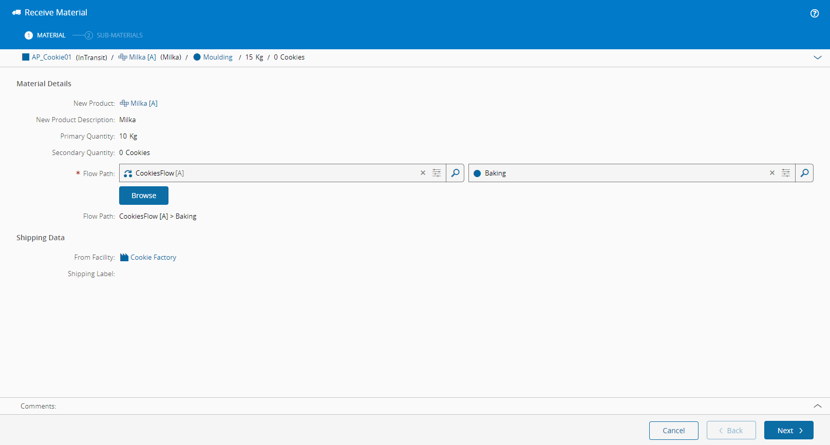 - Specify (or validate) the new Product in which the Sub-Materials will be created in the new Facility.