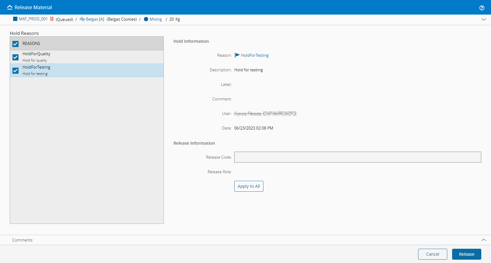 - If a Release Role is associated with the Hold Reason, the user performing the Release Material must belong to that Role.