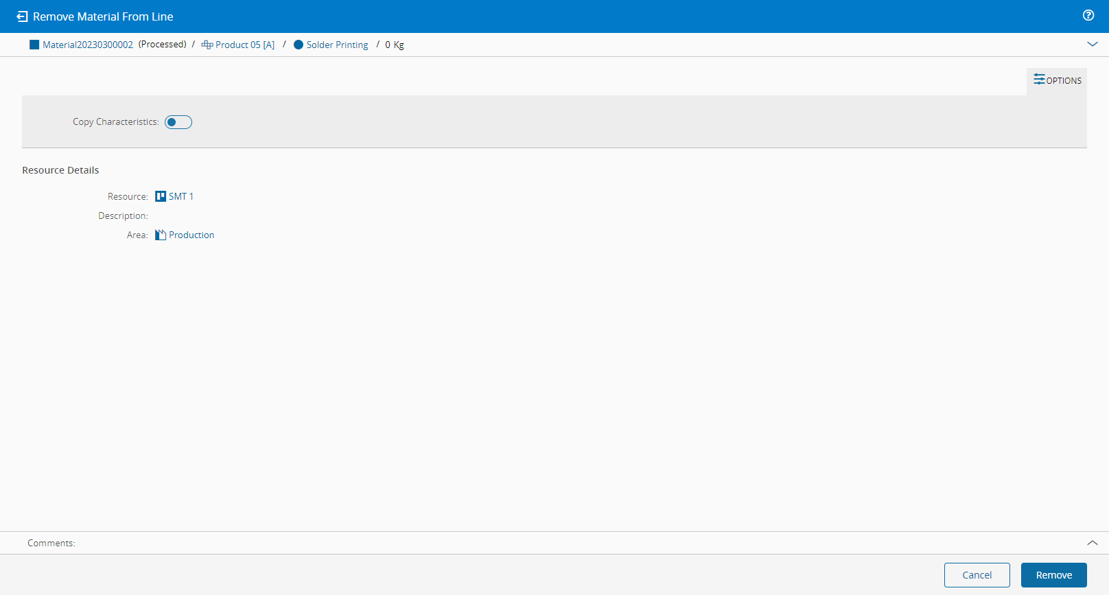 This operation is used to remove a Material from a parent Material that is tracked-in (in process) at a Line. As a naming convention, the Material to be removed is called Child Material and the Material from where the Material will be removed is called Parent Material.