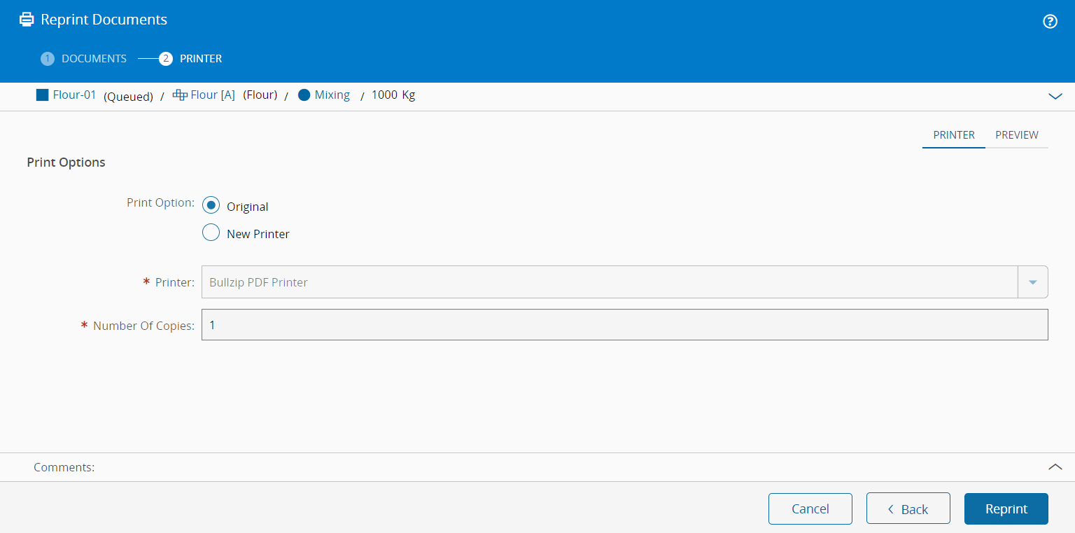 If multiple documents to reprint have been selected, a New Printer can only be set if the Printer Type of all the selected documents is the same.