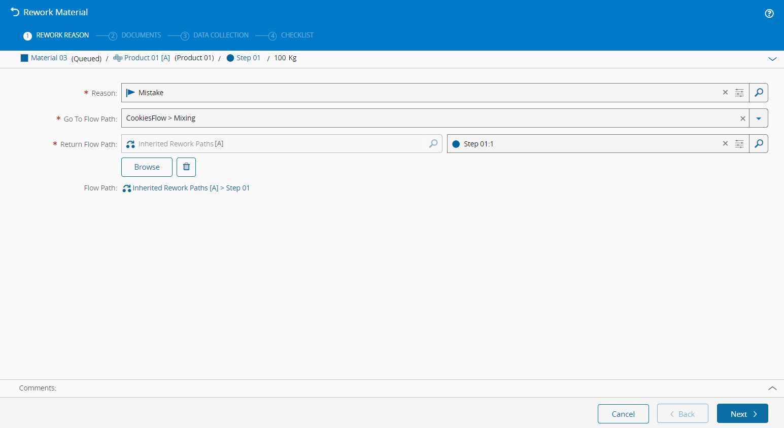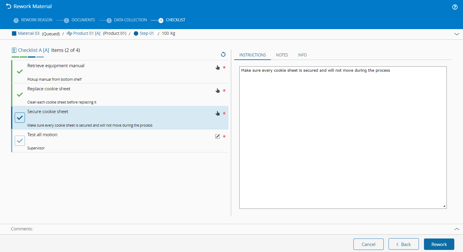 - Selected Rework Reason exists, is active and is currently assigned to the current Material Step and classified as applicable to Rework