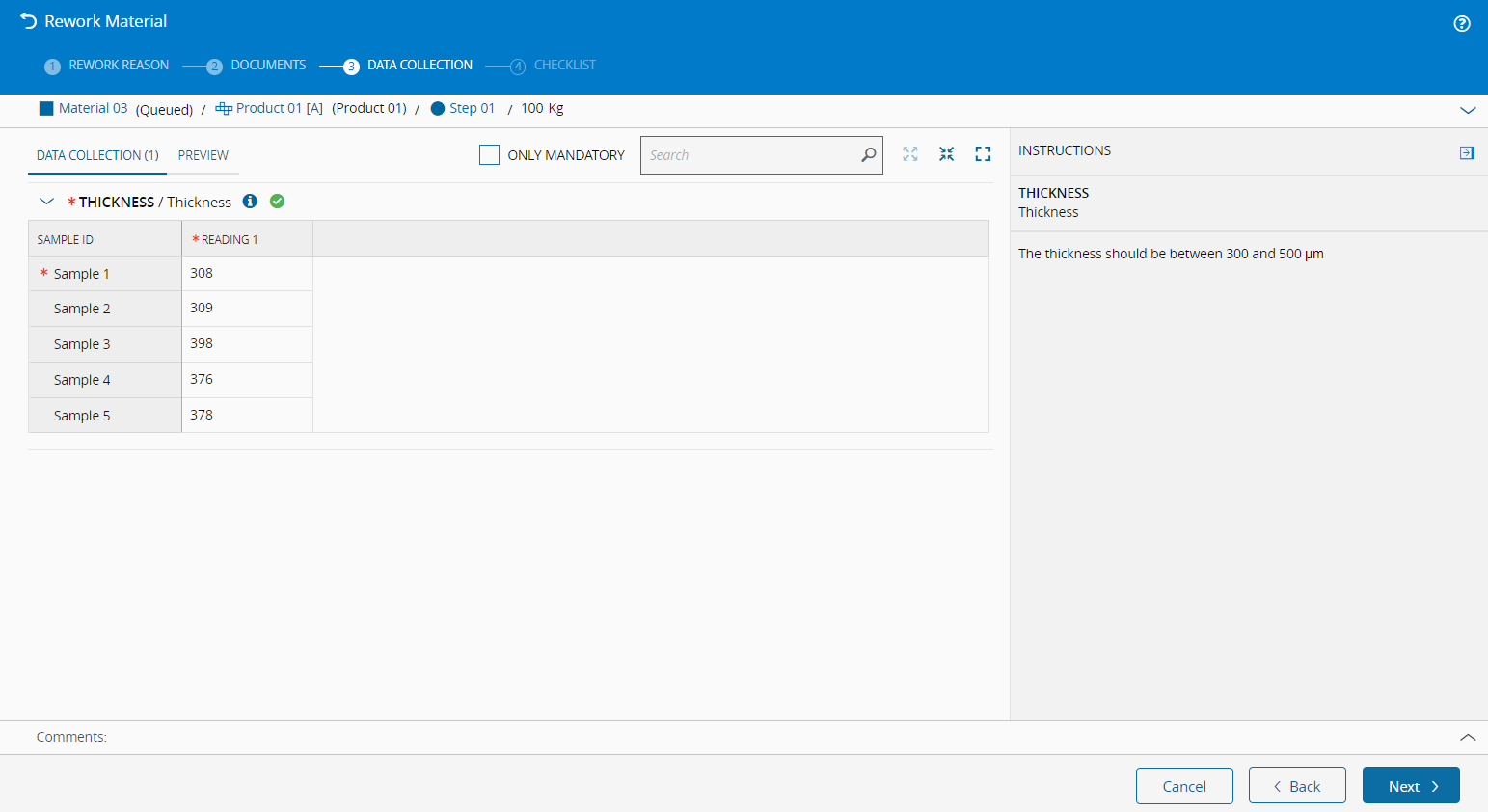 This step is visible only when a Data Collection is associated with the current Material Context and when the Material is Top-Most. Configure Data Collections through the MaterialDataCollectionContext Smart Table or directly in the Step Context View. For more information, see Create Data Collection.