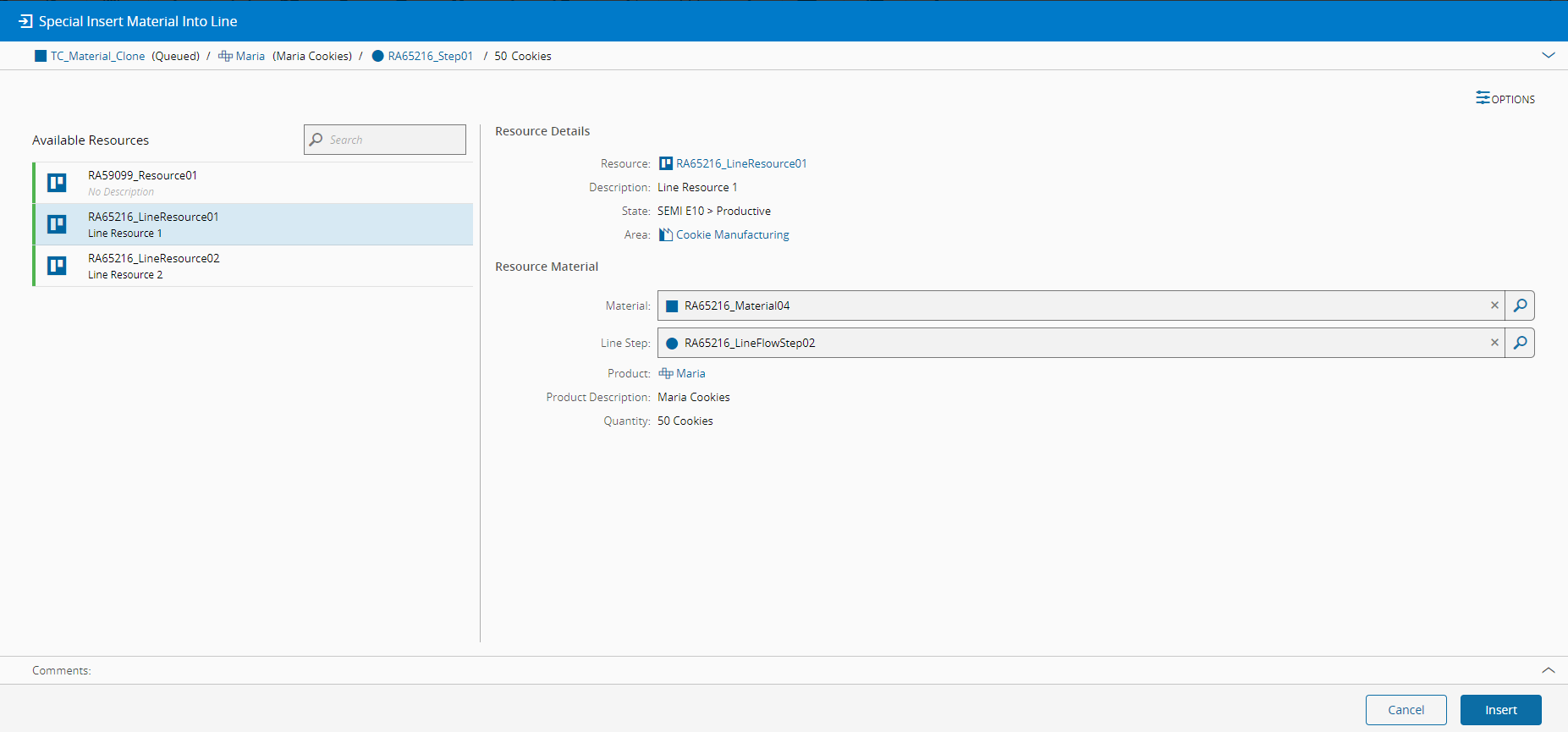 This operation is used to insert a Material into a parent Material that is tracked-in (in process) at a Line, allowing the user to select the specific Line Step where the Material will be inserted. As a naming convention, the Material to be inserted is called Child Material and the Material where the Material will be inserted is called Parent Material.