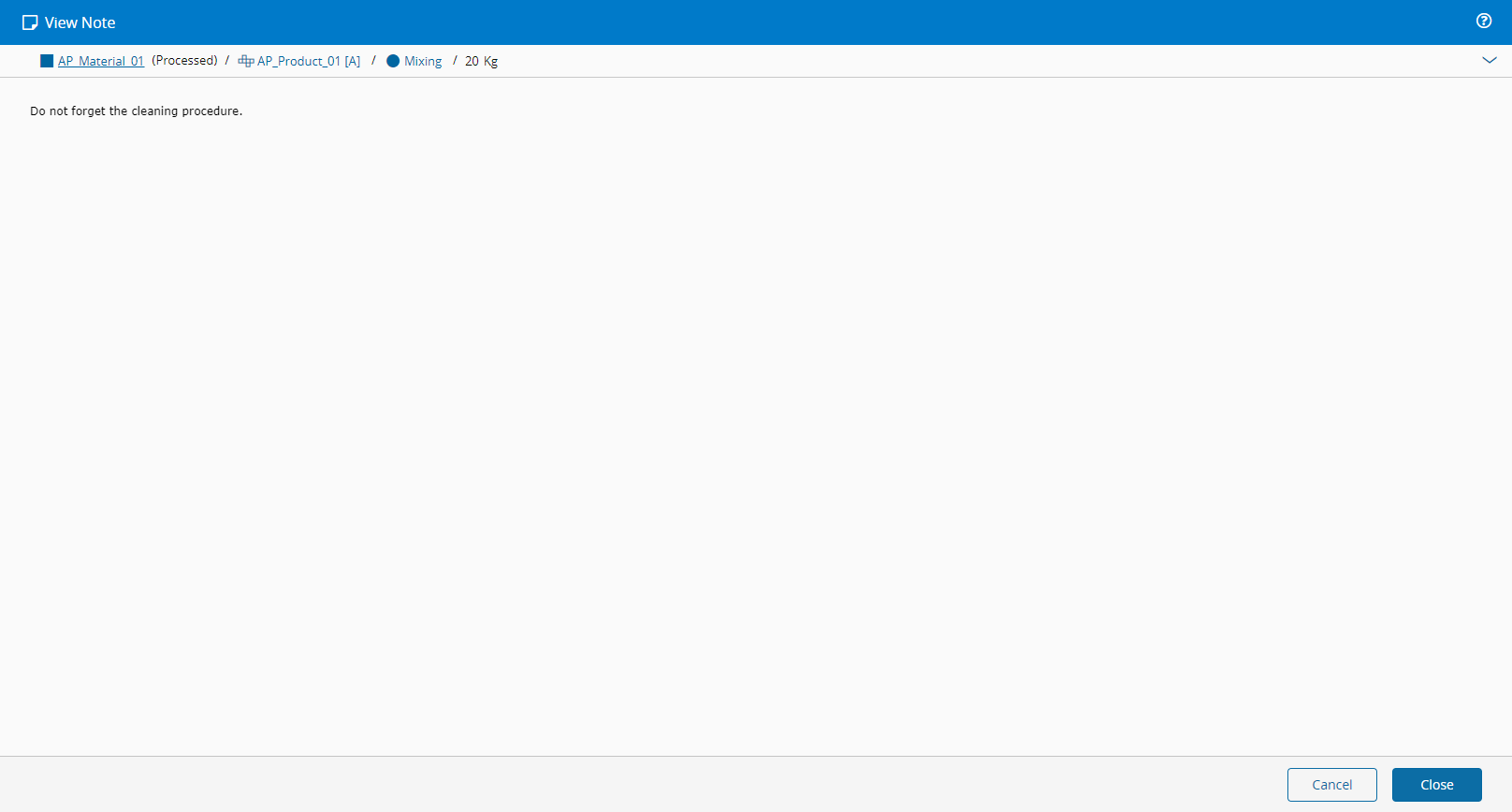 This operation is used to view a Note that is associated with the current Material context.