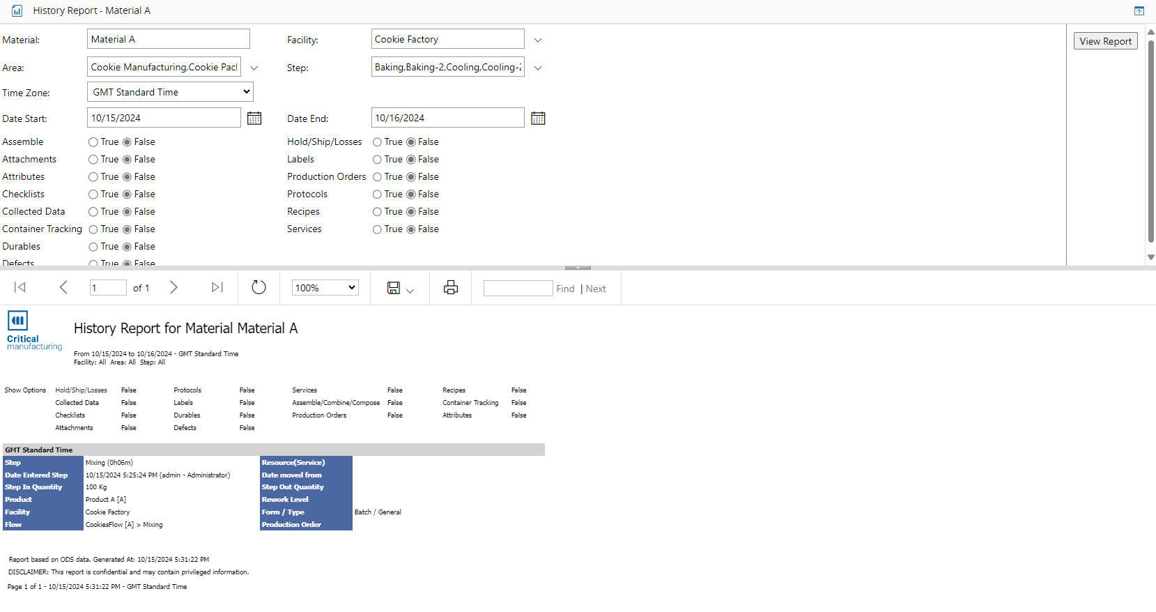 - History Report (for more information, see Material History)