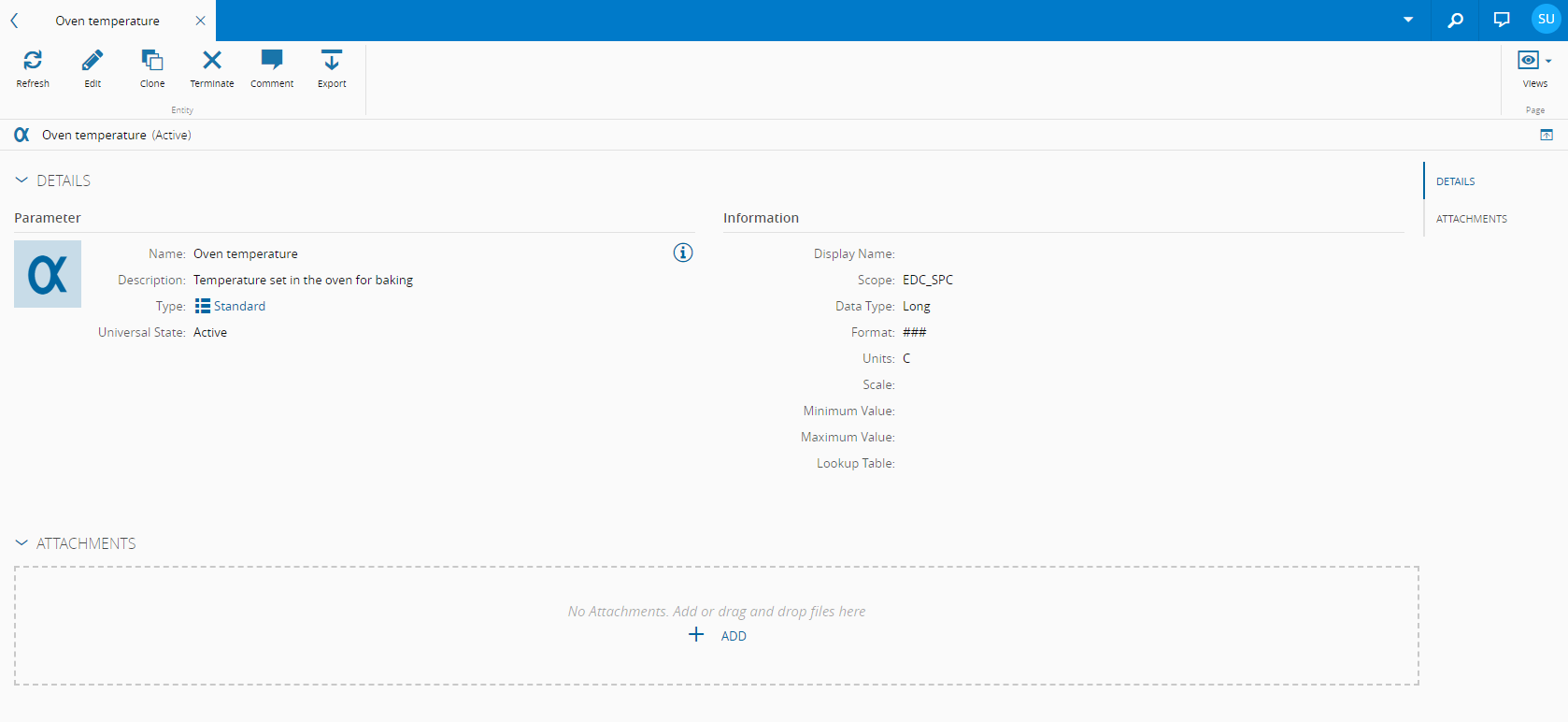 - Attachments - shows the documents that are attached to the Parameter and enables the user to attach additional documentation to the Parameter.