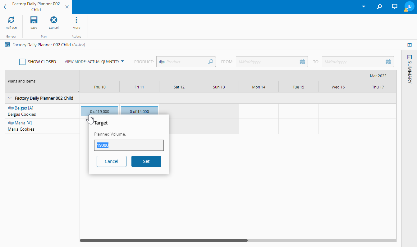 Much like the Edit Plan Scenario, adjusting the targets of a Plan Scenario places the current Plan Scenario in an editing mode, allowing you to perform changes to the planned values defined for each of the time frames available. Selecting any of the grid cells will show a small popup dialog where you can enter the new target value for that time frame.